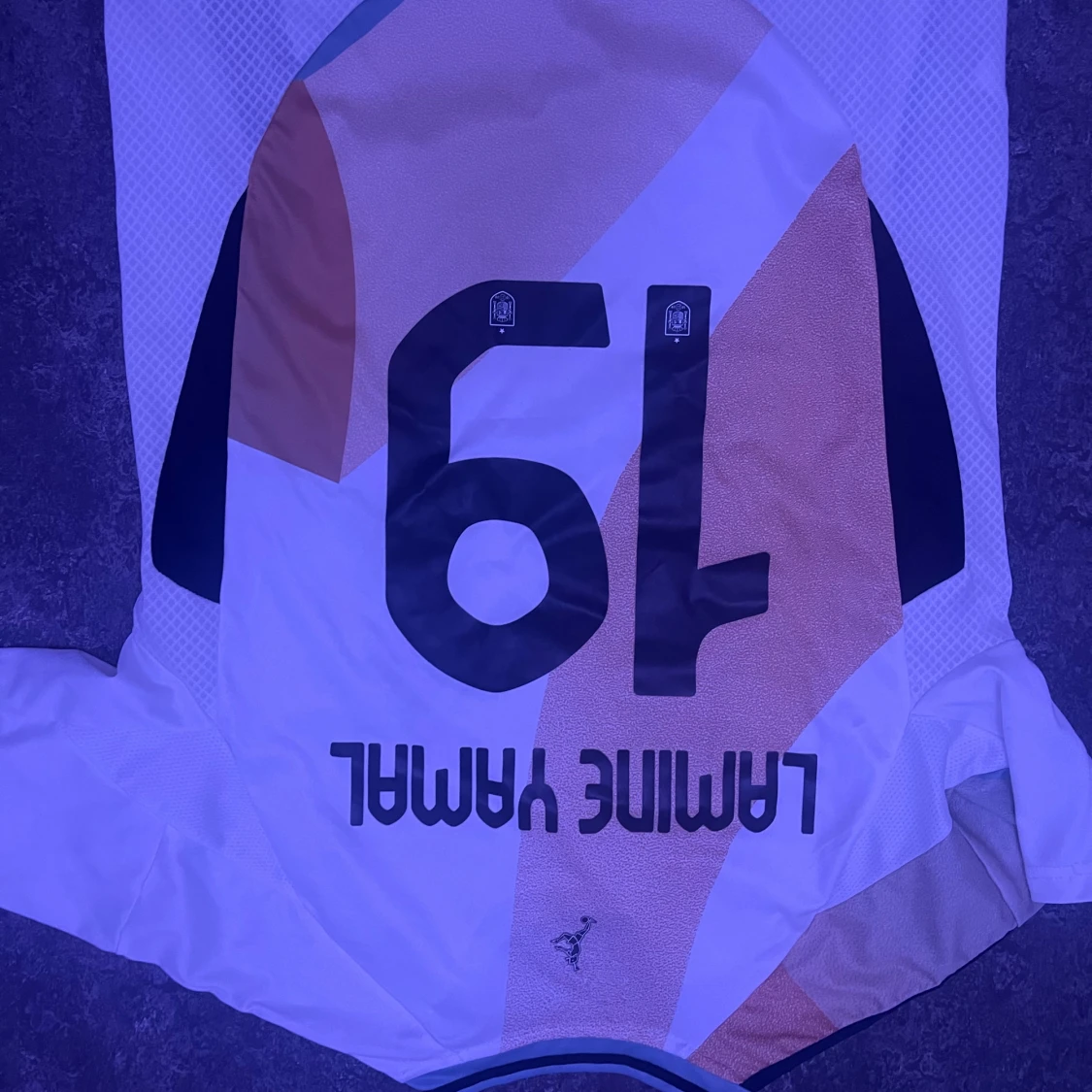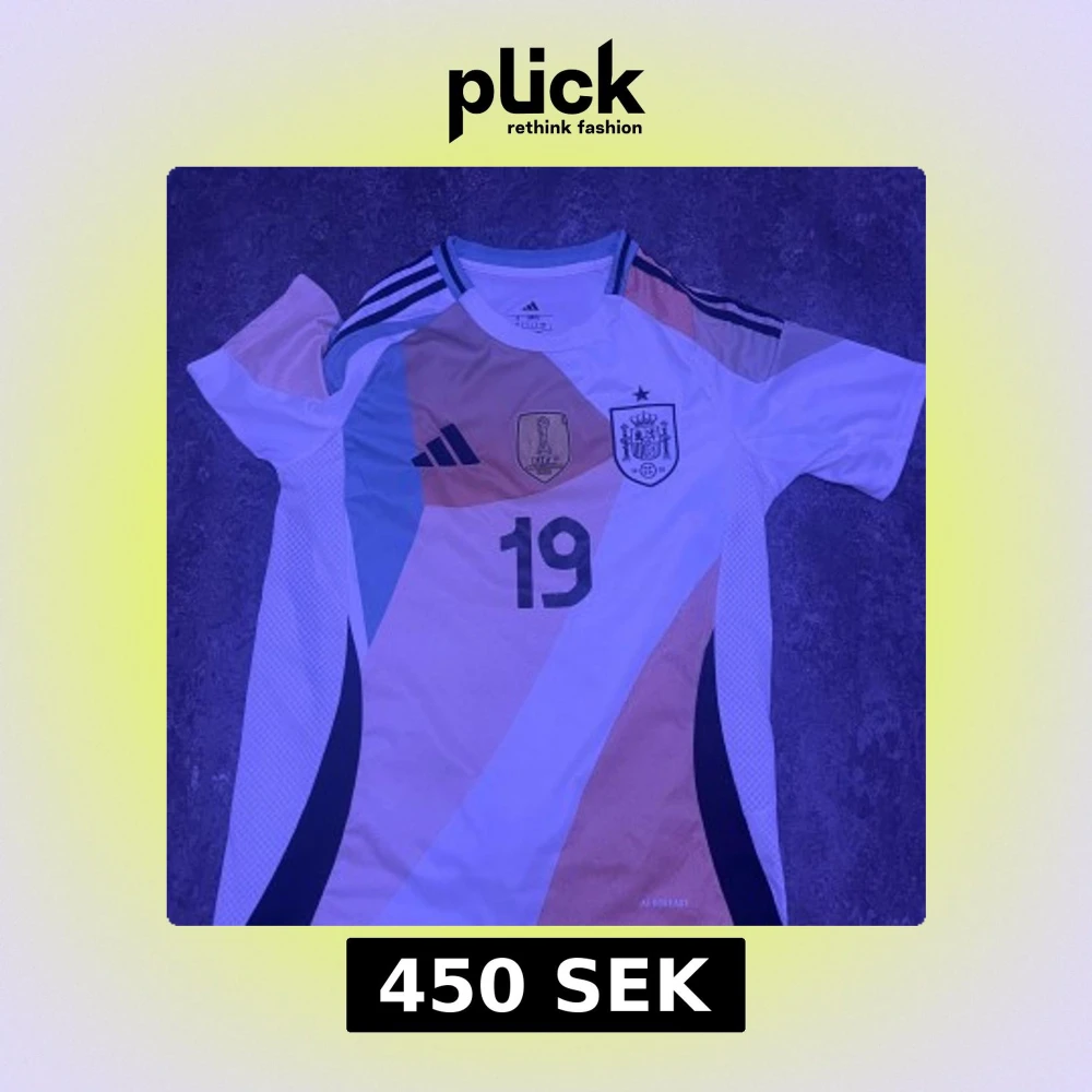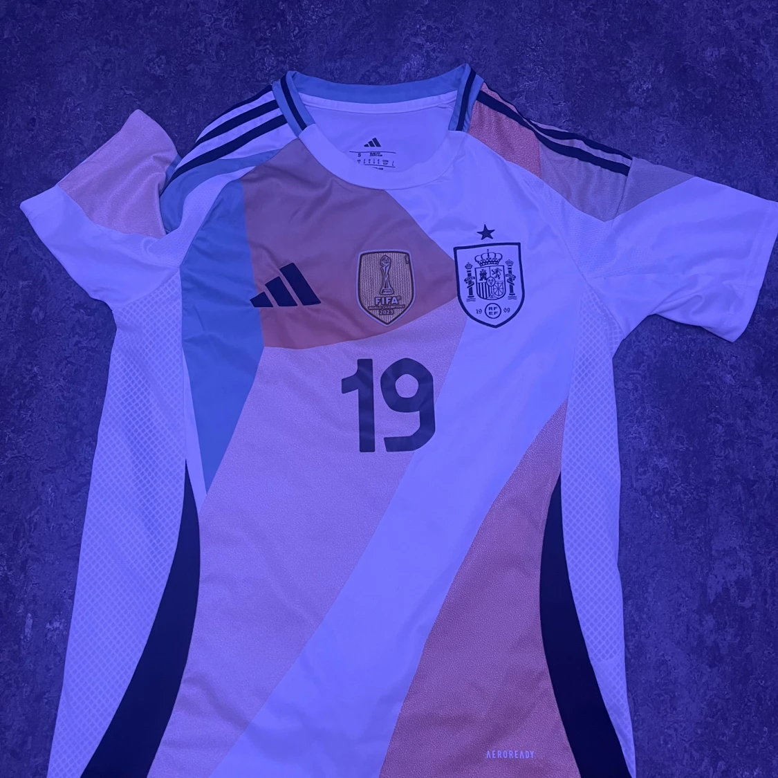 Spanien landslagströja från Adidas med nummer 19 och namn Lamine Yamal. Tröjan har korta ärmar, broderat landslagsmärke, FIFA World Champions 2023-märke och flera färgblock i vitt, guld, blått och svart. Tillverkad i lätt och ventilerande polyester (AEROREADY). Är storlek S men passar även mig som vanligtvis tar M