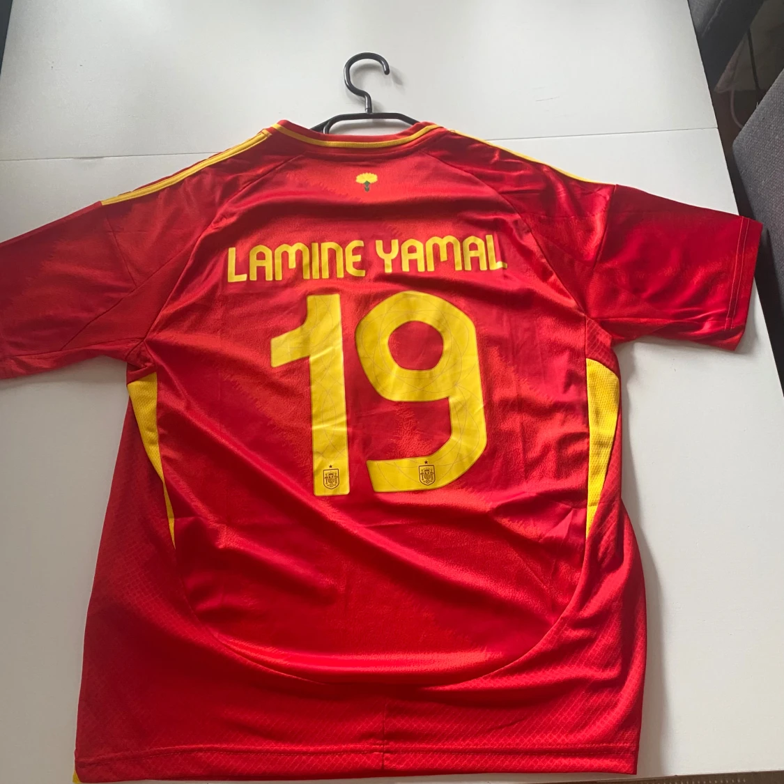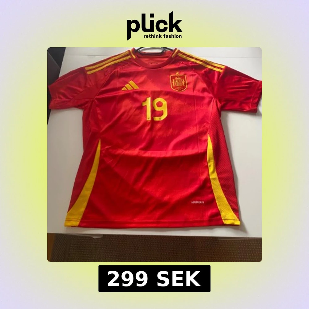 Röd fotbollströja med gula detaljer, nummer 19 och Lamine Yamal på ryggen. Officiellt Spanien-emblem på bröstet och klassiska ränder på axlarna. Tillverkad i lätt och ventilerande material, perfekt för match eller träning.