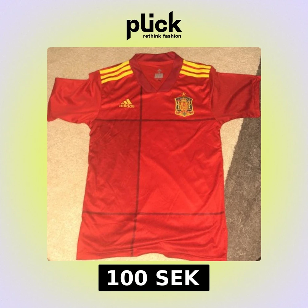 Röd fotbollströja från Adidas med Spaniens landslagsmärke på bröstet och gula detaljer. Tröjan har korta ärmar, gula ränder på axlarna och ett subtilt rutmönster framtill. Perfekt för dig som vill visa ditt stöd för Spanien.