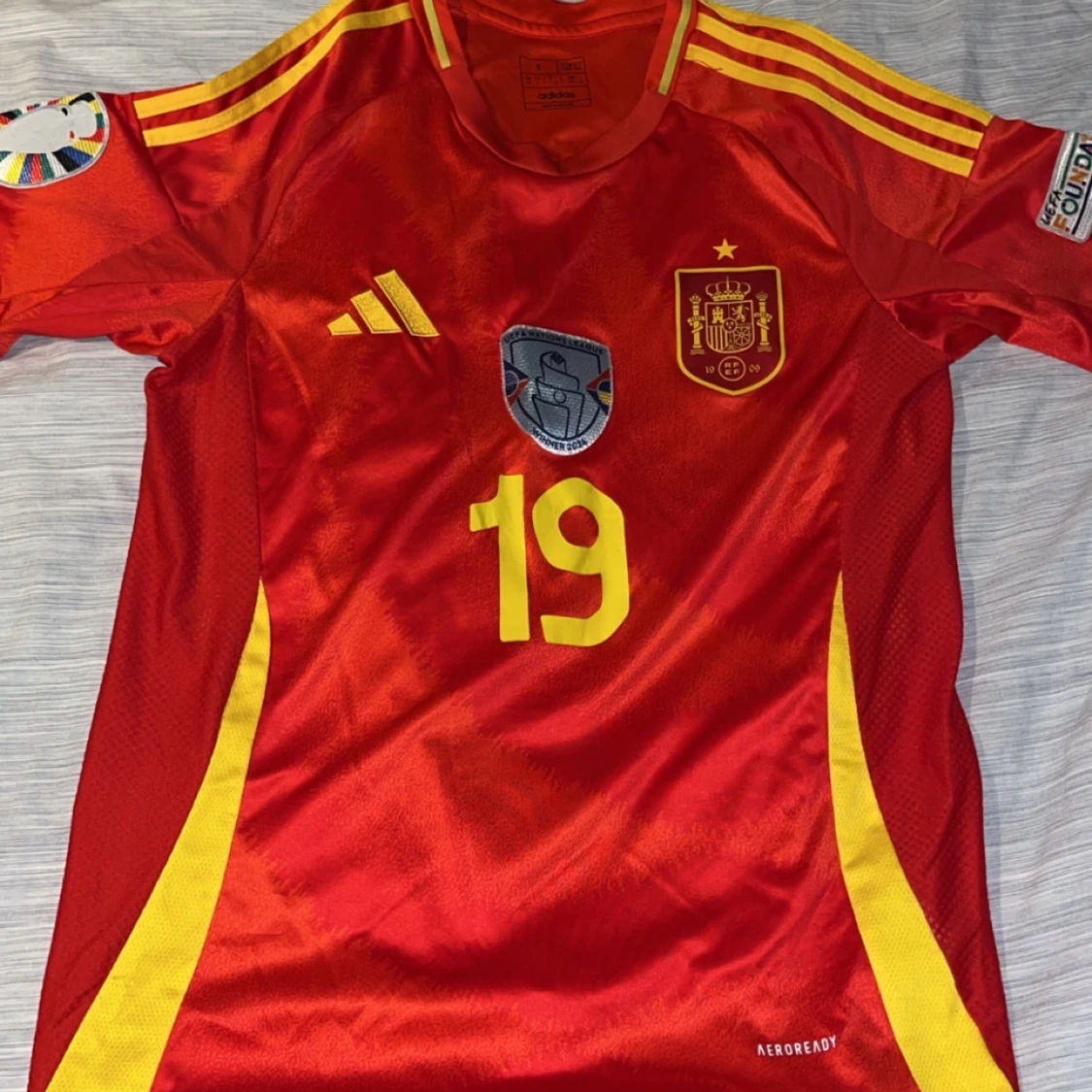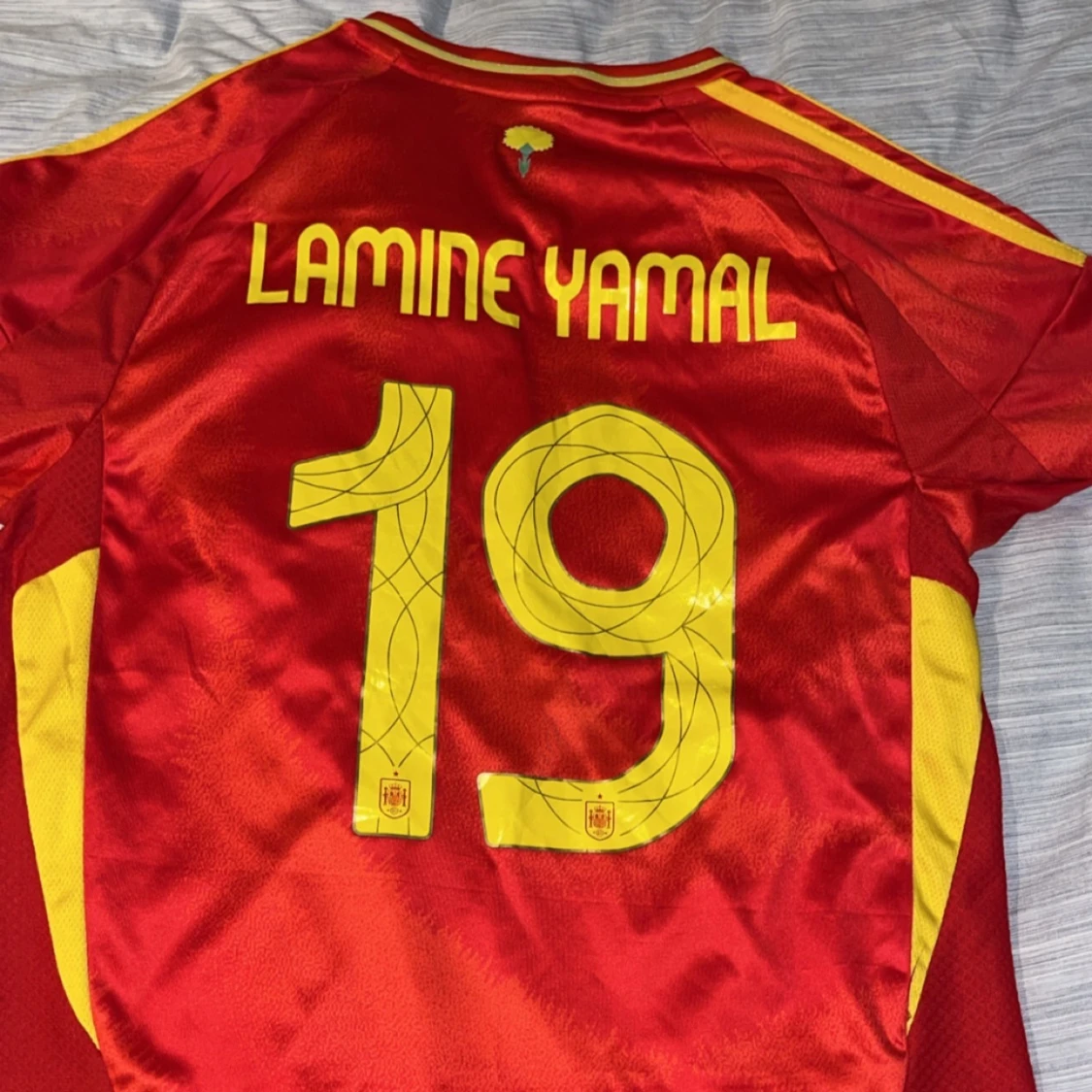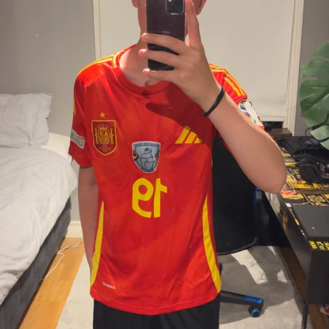 Säljer en röd Spanien fotbollströja från Adidas i slim fit, storlek S. Tröjan har gula detaljer, nummer 19 på framsidan och Nations League-vinnarmärke. tillverkad i lätt polyester med ventilerande paneler. Svinsnygg Lamine Yamal fotbollströja och ett väldigt bra skick💯