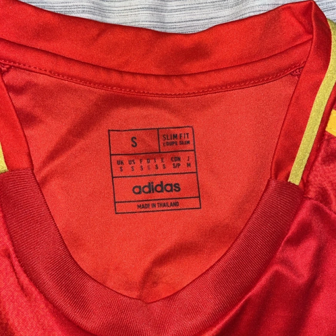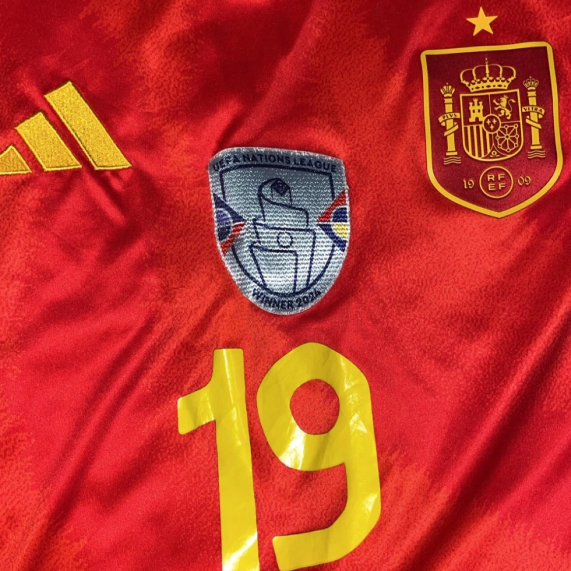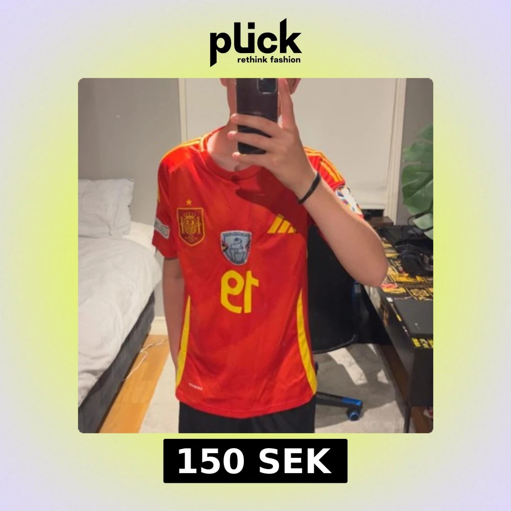 Säljer en röd Spanien fotbollströja från Adidas i slim fit, storlek S. Tröjan har gula detaljer, nummer 19 på framsidan och Nations League-vinnarmärke. tillverkad i lätt polyester med ventilerande paneler. Svinsnygg Lamine Yamal fotbollströja och ett väldigt bra skick💯