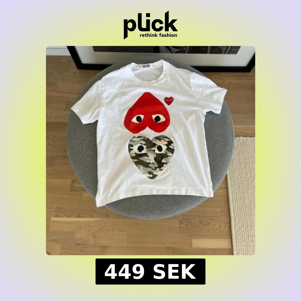 Vit t-shirt från Comme des Garçons Play med två stora hjärttryck på framsidan, ett rött och ett i camouflage. Klassisk passform och korta ärmar. Ikonisk design som sticker ut och passar perfekt till jeans eller shorts. Storlek S men sitter aningen kort hade passat någon som är 172 och neråt. Tröjan är använd en gång