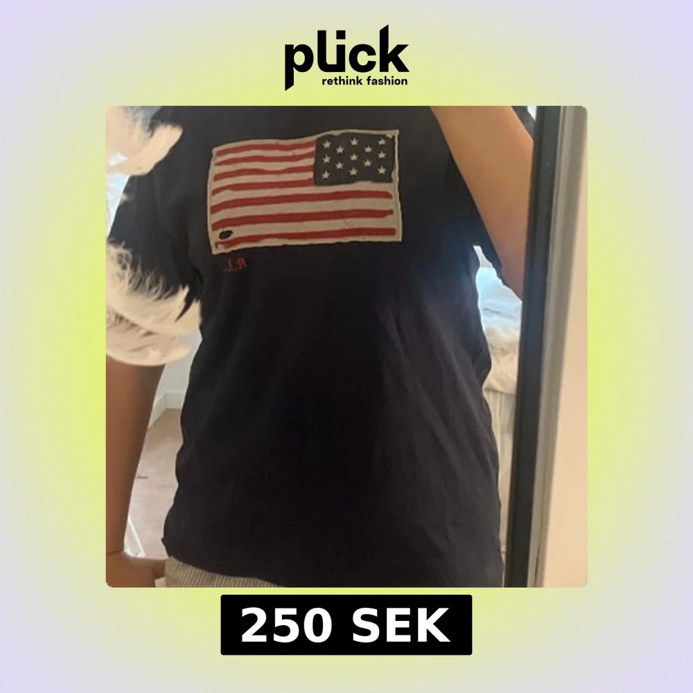 Mörk blå raulph lauren t shirt i storlek XL(18-20år) med en flagga vid bröstet! Hålet i flaggan är design och såg ut så när vi köpt den!💓