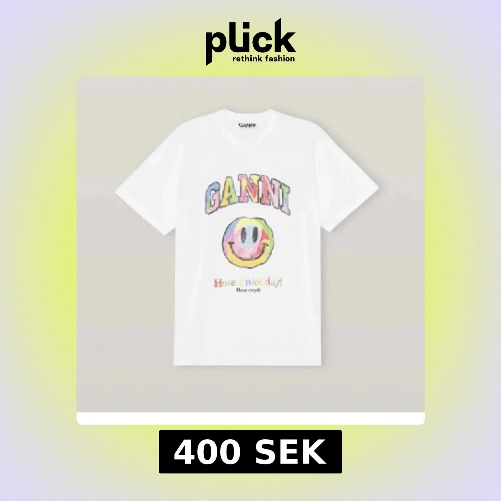 Vit t-shirt från Ganni med färgglatt tryck framtill. Overzised passform och rund halsringning. Perfekt för dig som gillar lekfulla och unika prints💗Pris kan diskuteras!!