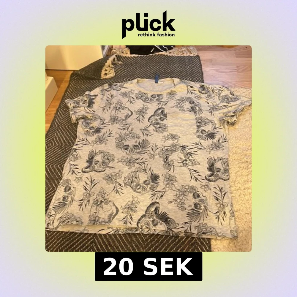 Säljer en grå t-shirt från H&M Divided med svart tryck av dödskallar, blommor och blad. T-shirten har rund halsringning och korta ärmar. Perfekt för dig som gillar lite edgy stil.