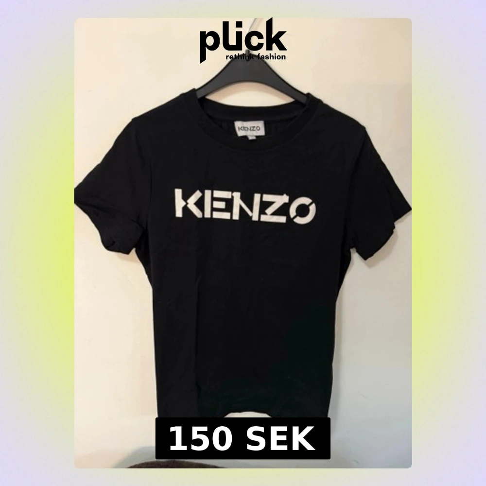Säljer en svart t-shirt från Kenzo med stor vit logga framtill. Klassisk rund halsringning och korta ärmar. Tillverkad i mjuk bomull för skön passform. Perfekt för dig som gillar stilrena och trendiga plagg med tydlig branding. Köpt för 999kr