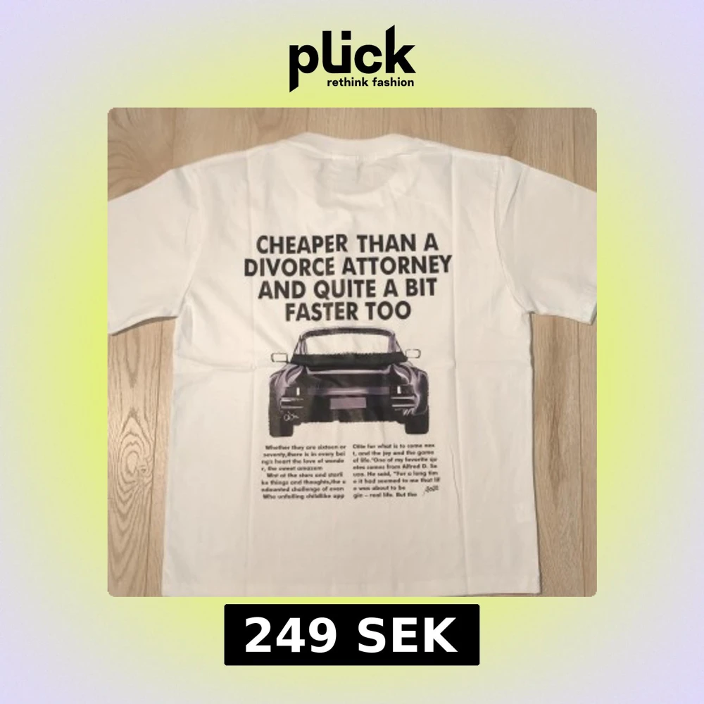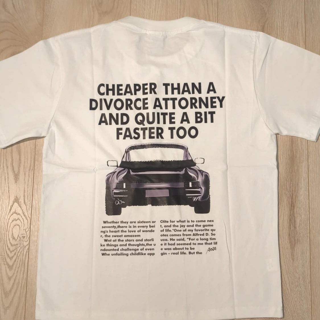 Vit t-shirt med stort tryck på ryggen föreställande en Porsche och texten “Cheaper than a divorce attorney and quite a bit faster too”. Tillverkad i 100% mjuk bomull med klassisk passform och rund halsringning. 📏Storlek M längd: 68cm. Bredd: 48cm. Oanvänd i fint skick. Meddela vid frågor!