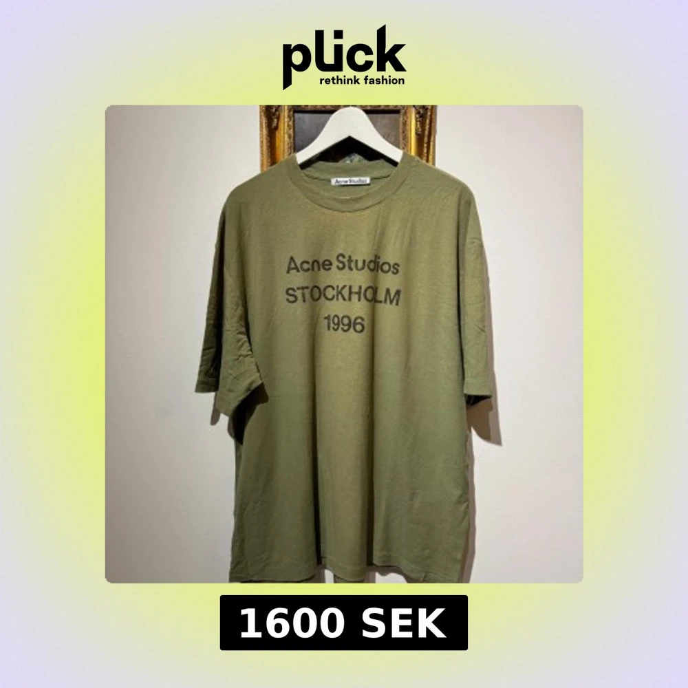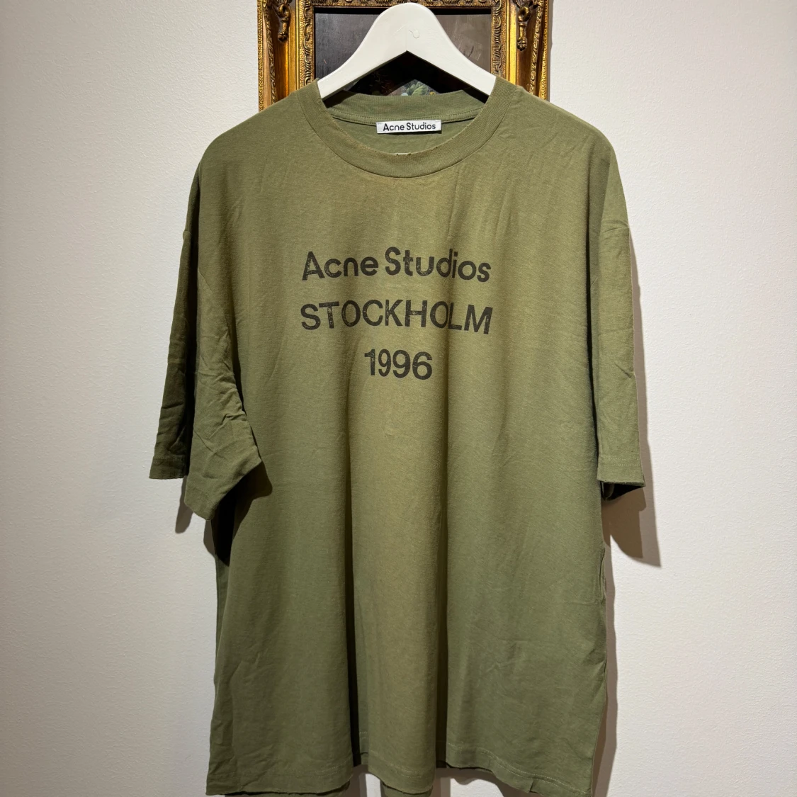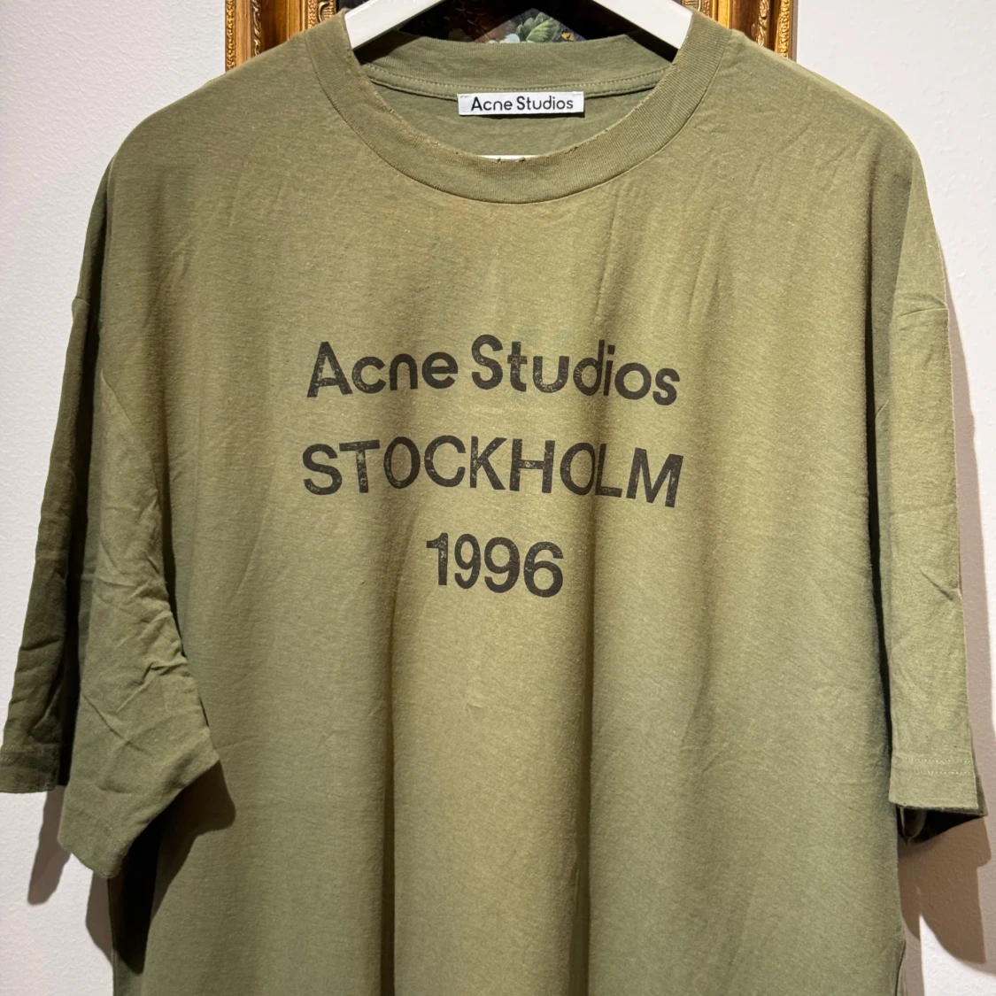 Olivgrön t-shirt från Acne Studios med svart tryck 'Acne Studios Stockholm 1996' på bröstet. Oversized passform, rund hals och korta ärmar. Tillverkad i mjuk bomull, perfekt för en chill och avslappnad stil.