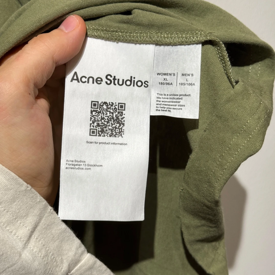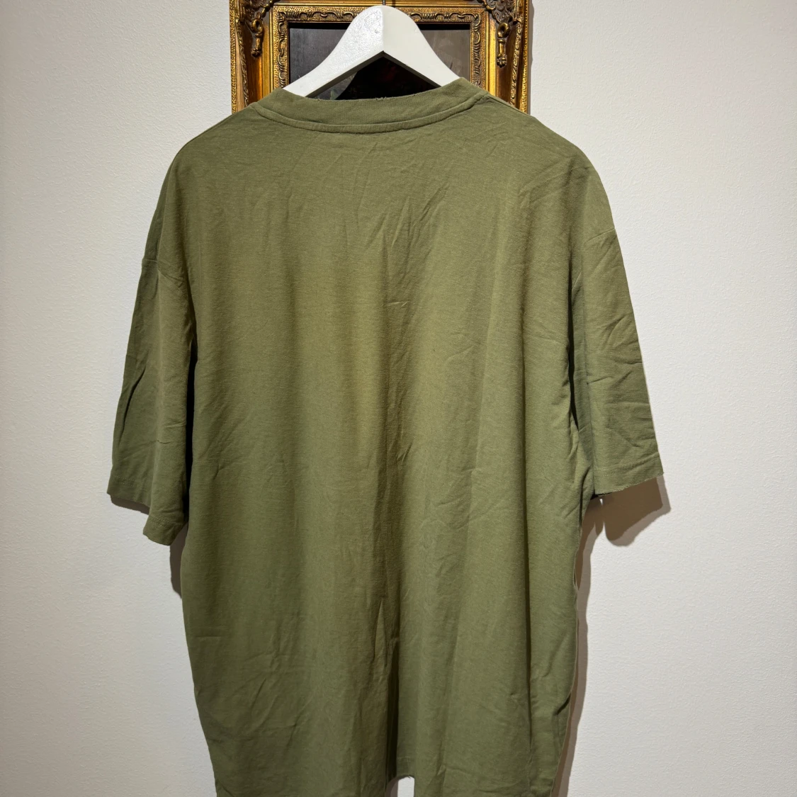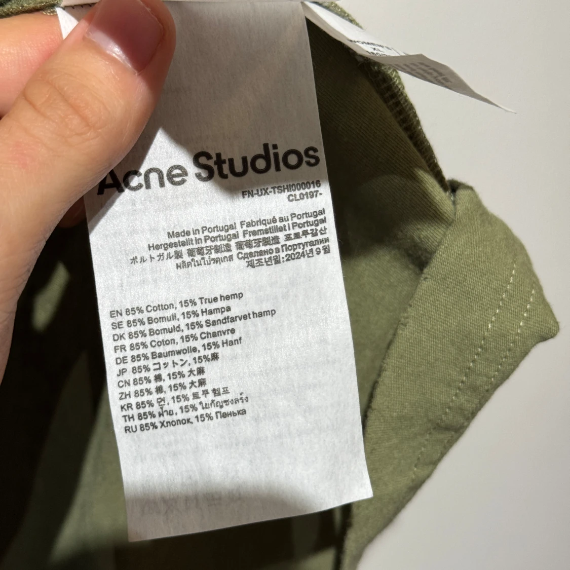 Olivgrön t-shirt från Acne Studios med svart tryck 'Acne Studios Stockholm 1996' på bröstet. Oversized passform, rund hals och korta ärmar. Tillverkad i mjuk bomull, perfekt för en chill och avslappnad stil.