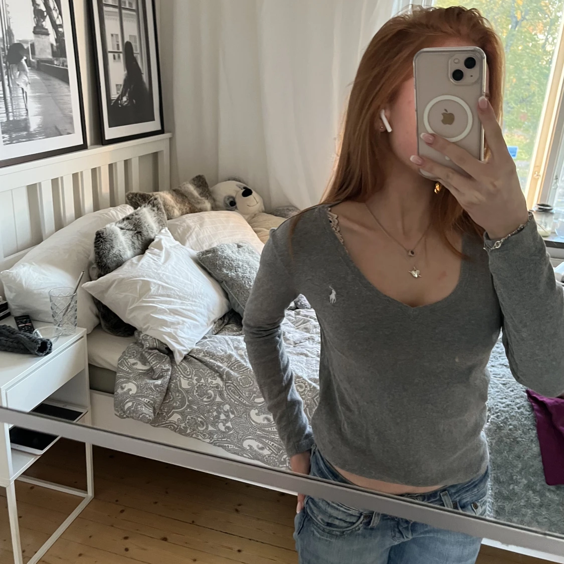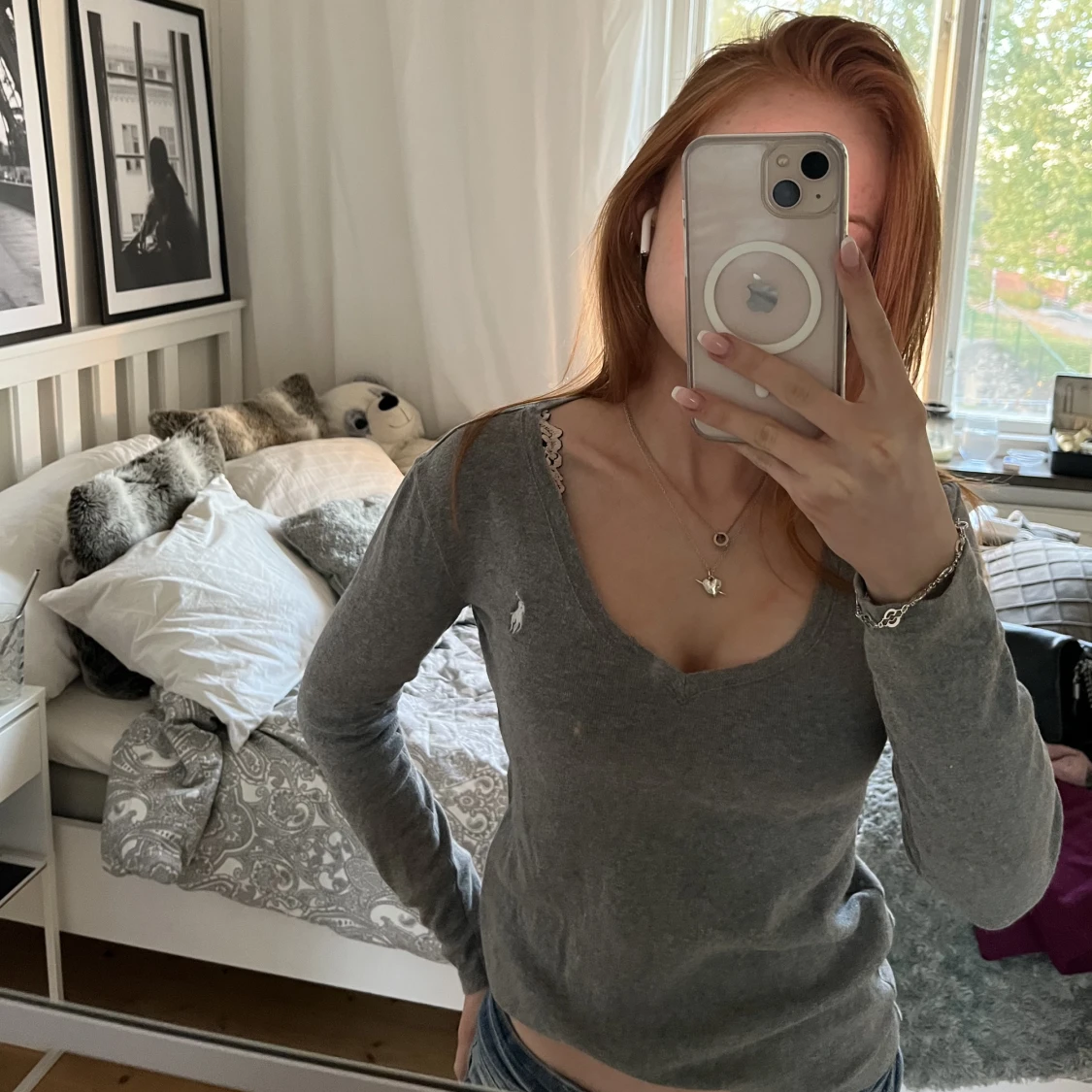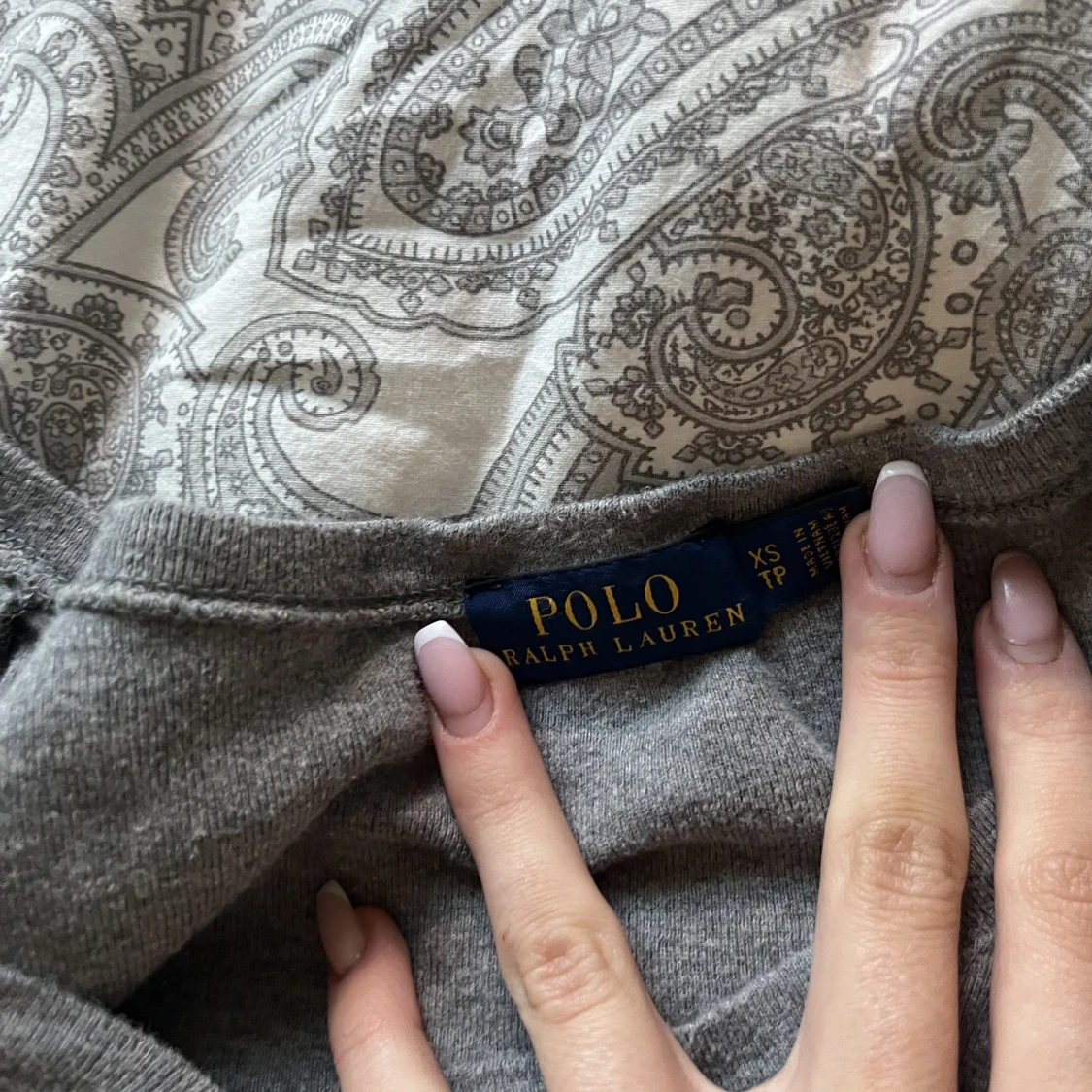 Långärmad t-shirt från Ralph Lauren. Äkta. Grå v-ringad. Stl xs🩷