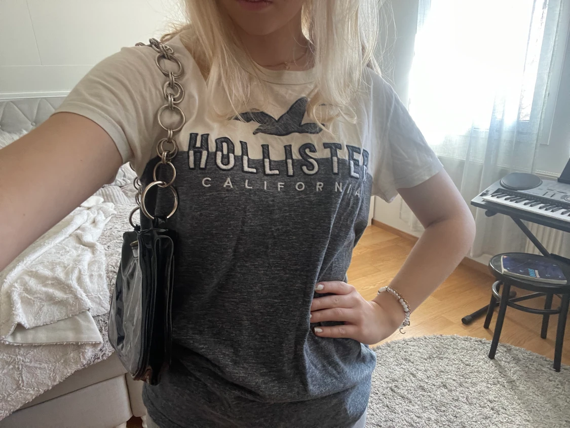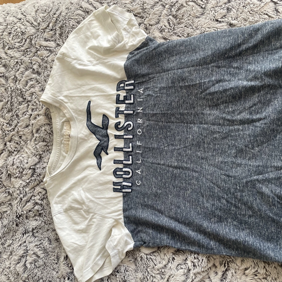 Tryck gärna på ” KÖP NU”. Nästintill oanvänd t-shirt från hollister i grått och vitt💙storlek XS men stor i storleken så den är mer som en M.