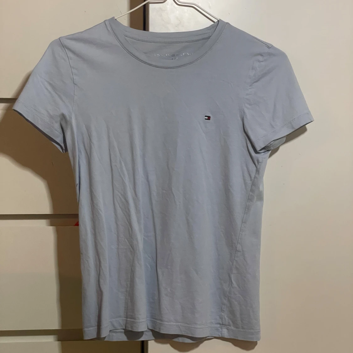 En stilren ljusblå t-shirt från Tommy Hilfiger med liten broderad logga på bröstet. Passar påse tjejer och killar. Kommer ej till användning. Pris kan diskuteras💞