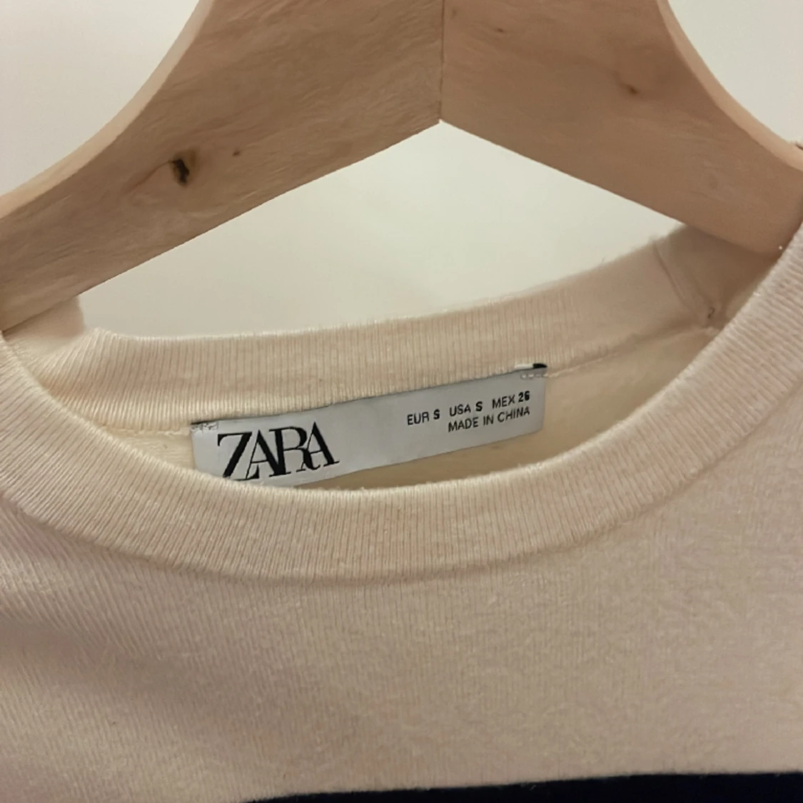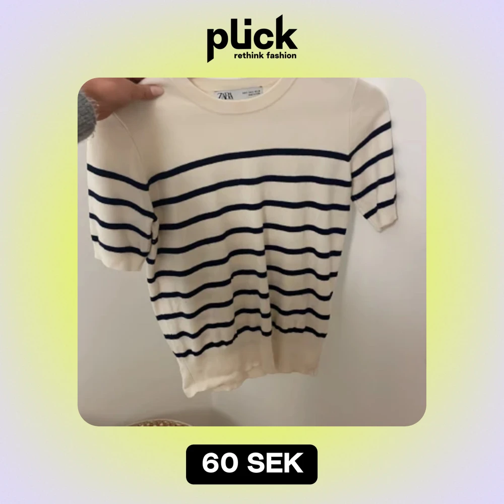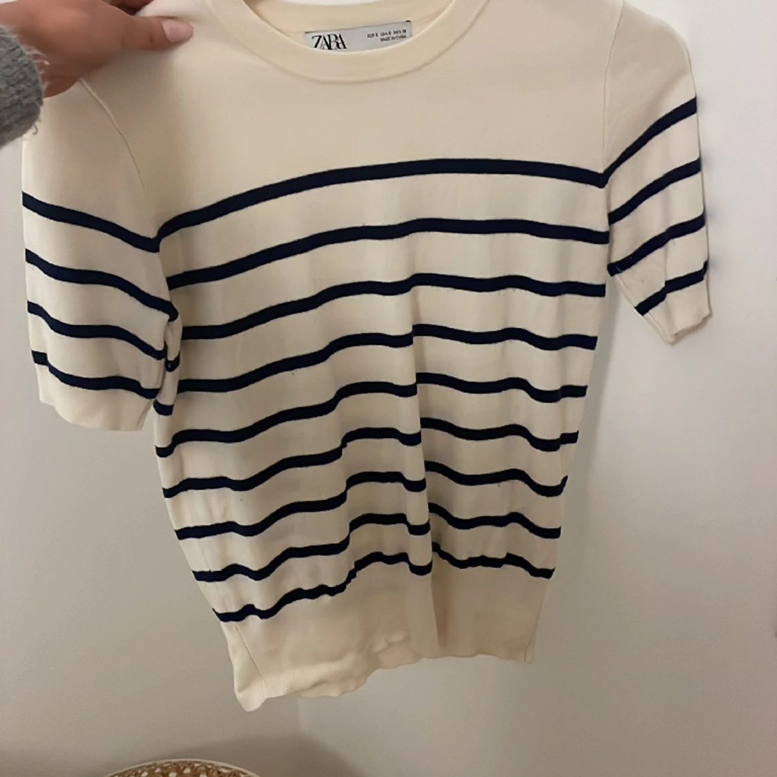 Jättefin vit med mörkblå ränder, stickad t-shirt från zara!! Säljer då den inte kommer till användning längre💞💞