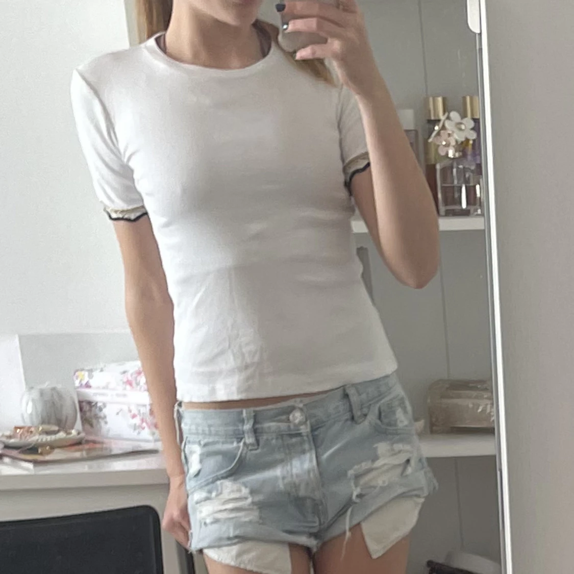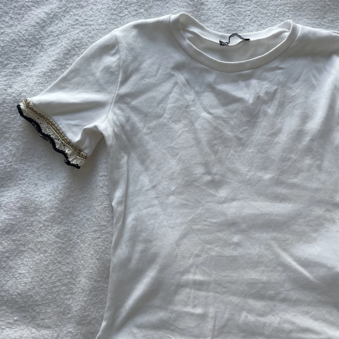 T-shirt med fina detaljer vid Ă€rmarnađ SĂ€ljer dĂ„ jag inte fĂ„tt anvĂ€ndning av den, anvĂ€nt ca 1 gĂ„ng