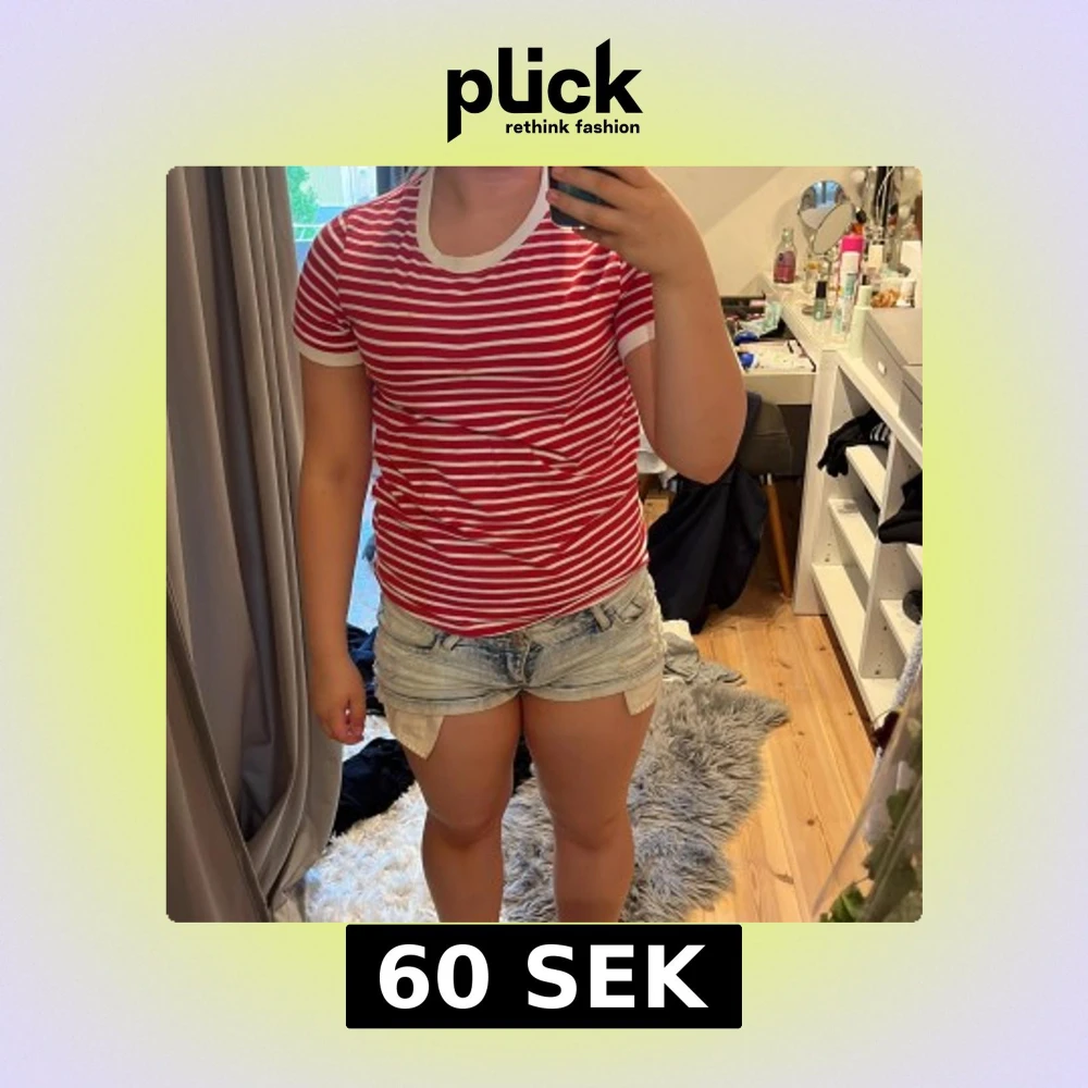 Säljer en röd och vit randig t-shirt med korta ärmar och vita muddar vid hals och ärmslut. T-shirten har en klassisk passform och är perfekt för en avslappnad stil. Materialet känns mjukt och skönt mot huden.