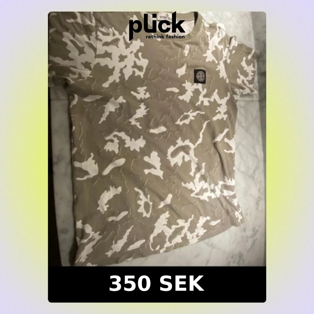 Säljer en beige t-shirt från Stone Island med vit camouflage-mönster och klassisk logopatch på bröstet. T-shirten har rund hals och korta ärmar. Perfekt för dig som gillar streetwear och vill sticka ut lite extra.