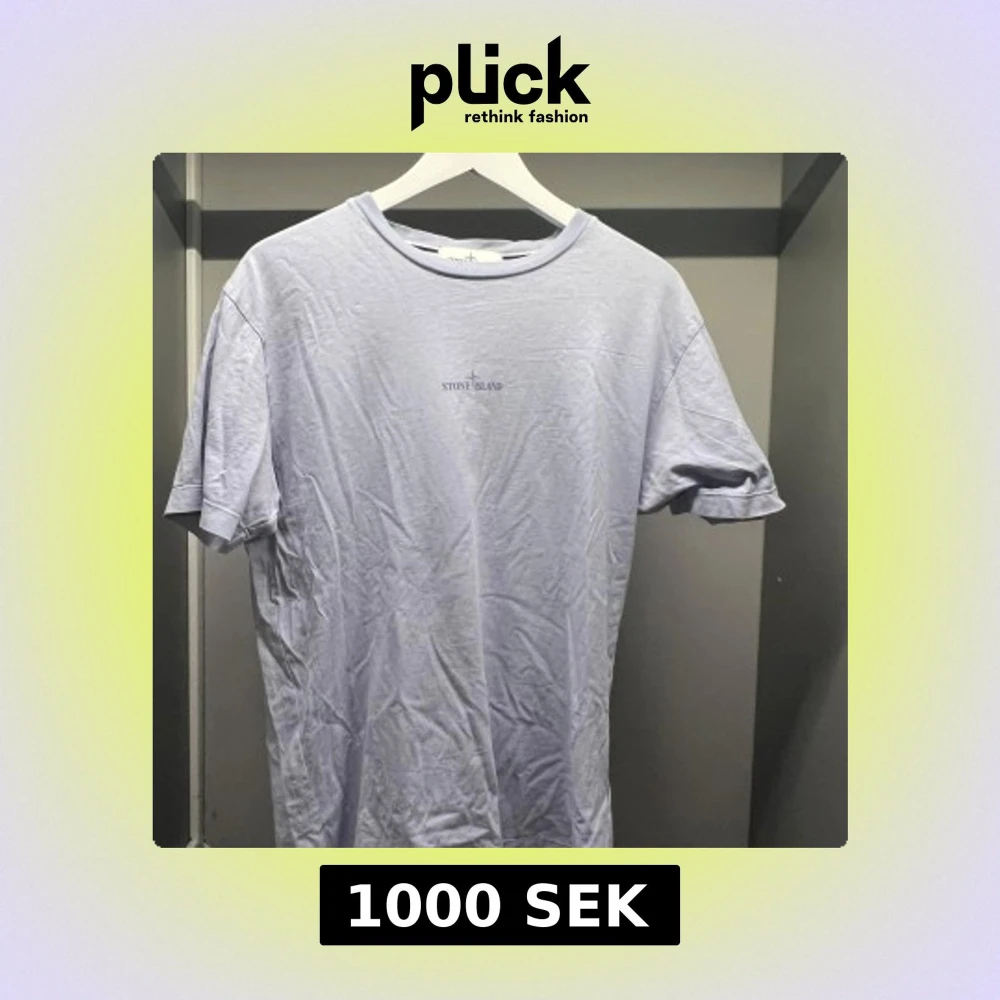 Säljer en ljusblå t-shirt från Stone Island med tryck på både fram- och baksidan. T-shirten har en klassisk rund hals och korta ärmar. Perfekt för en avslappnad stil.