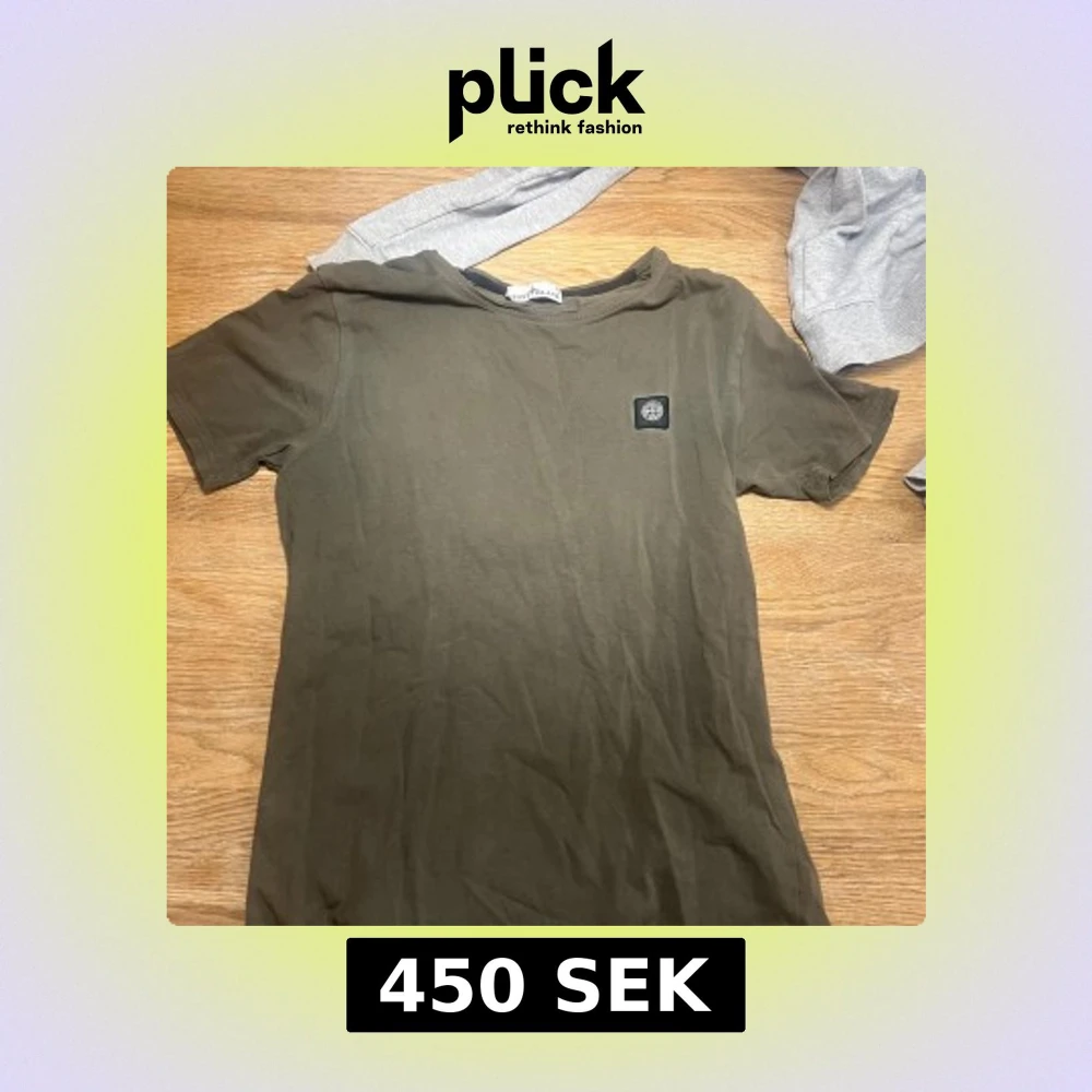 Säljer en olivgrön t-shirt från Stone Island med en liten logotyp på bröstet. T-shirten har en klassisk rund hals och korta ärmar. Perfekt för en avslappnad stil.