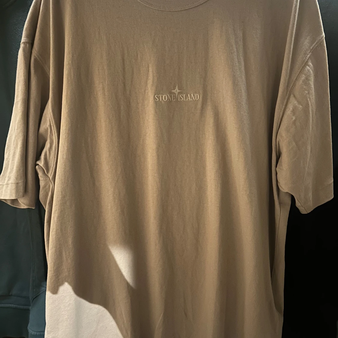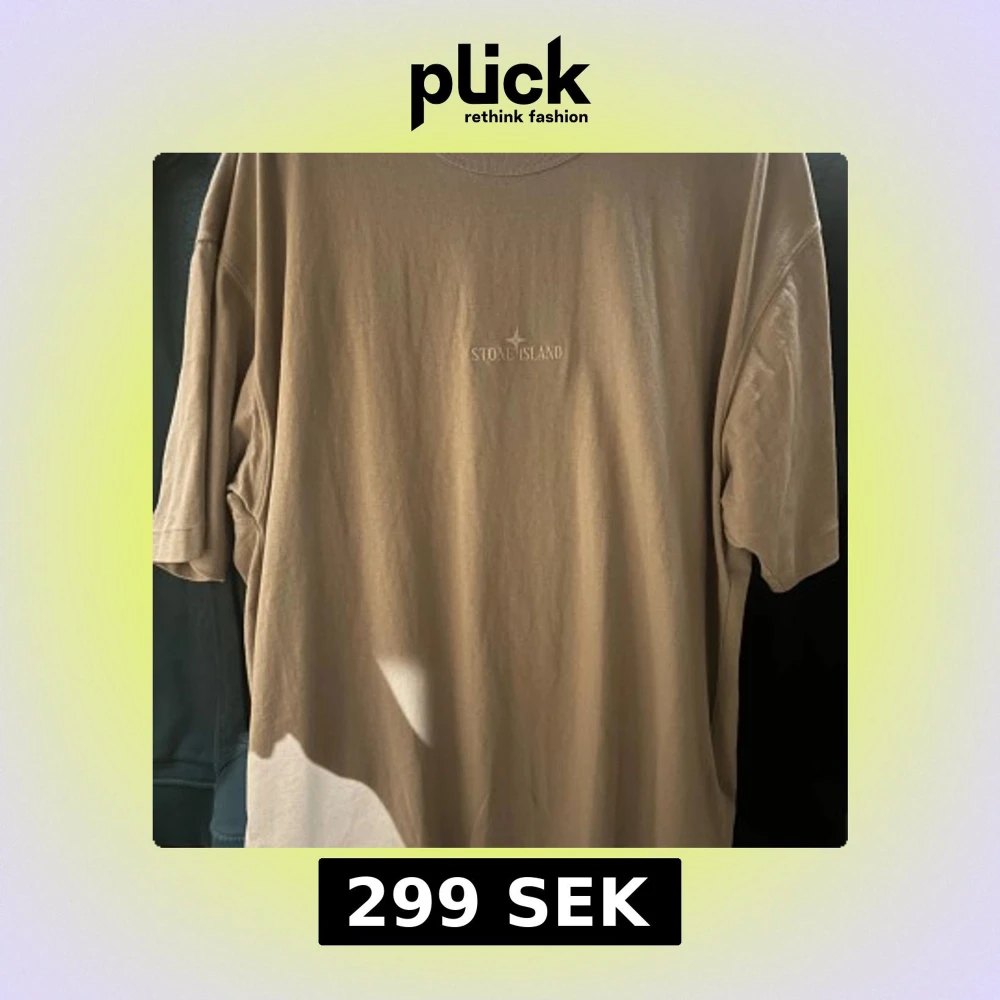 Säljer en stilren beige t-shirt från Stone Island. Den har en normal passform och korta ärmar. Perfekt för en avslappnad look. Märkesloggan är diskret placerad på bröstet.
