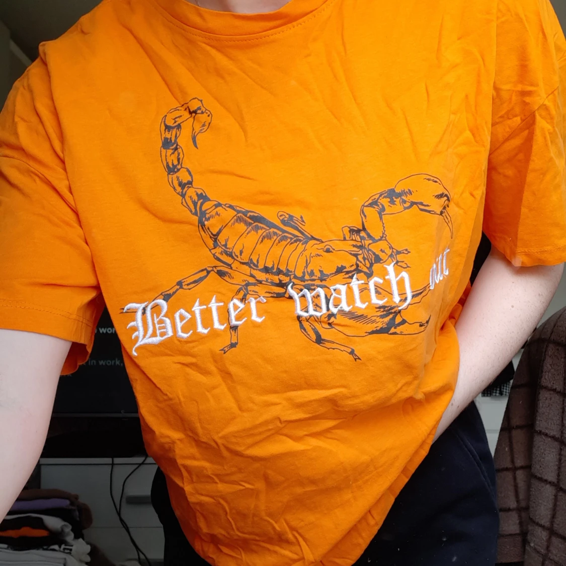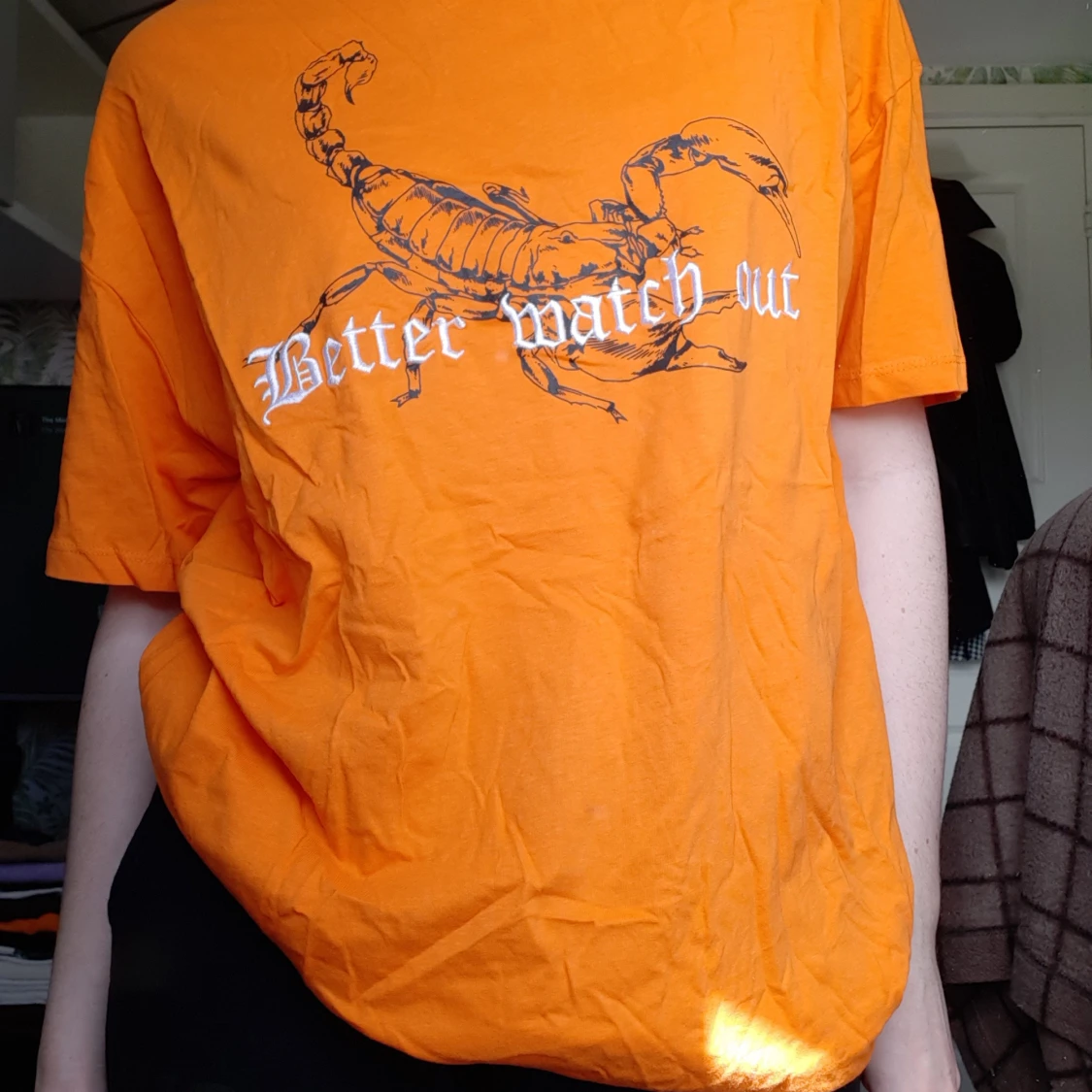 Orange oversized t-shirt med ett skorpion-tryck. Använd ensadt en gång och den används inte längre🧡