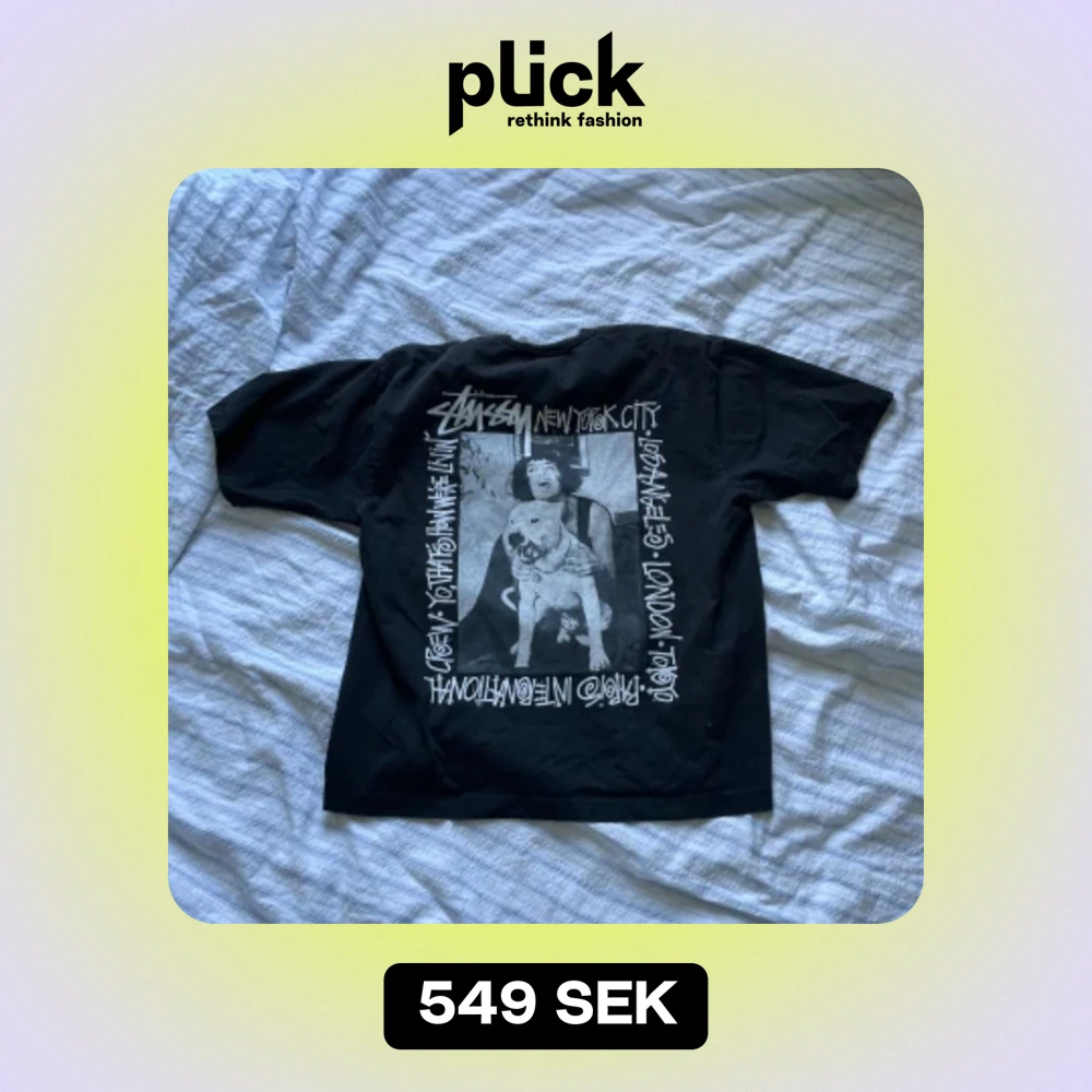 Stussy t-shirt med överfett print på baksidan. Använd några gånger men i nästan perfekt skick och nice passform. Skick: 9/10