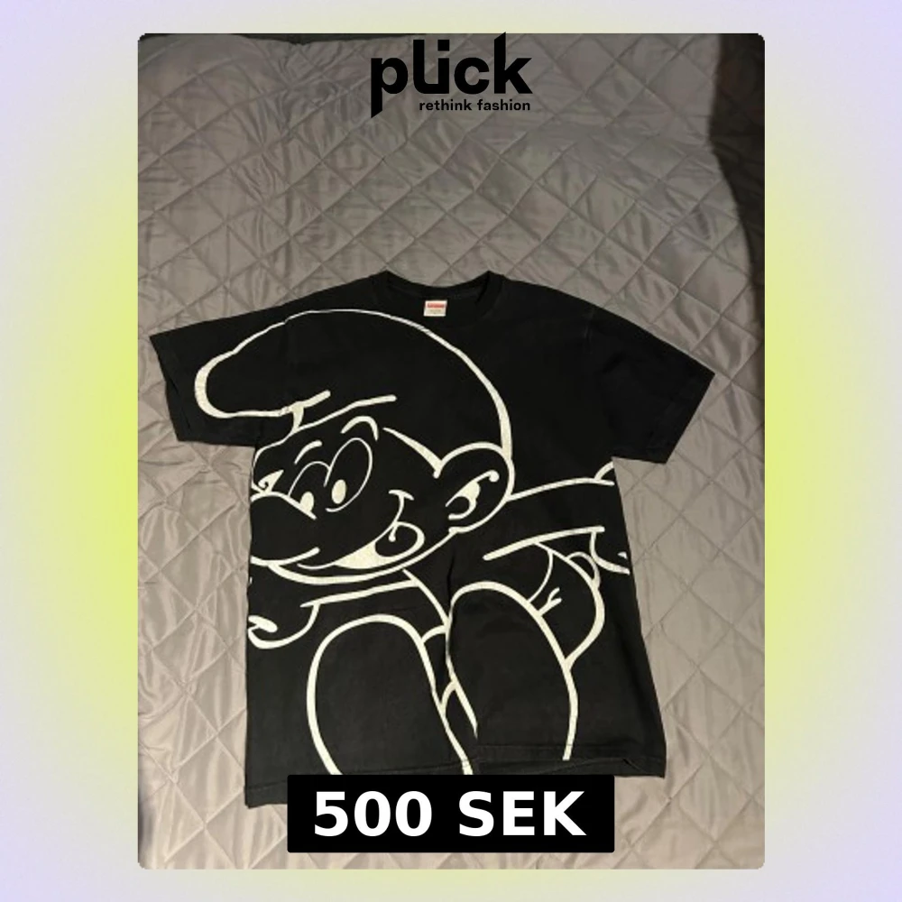 Supreme t-shirt i svart bomull med stor vit Smurfarna-grafik på framsidan och SUPREME-tryck över ryggen. Klassisk passform och korta ärmar, perfekt för dig som gillar streetwear och unika prints.
