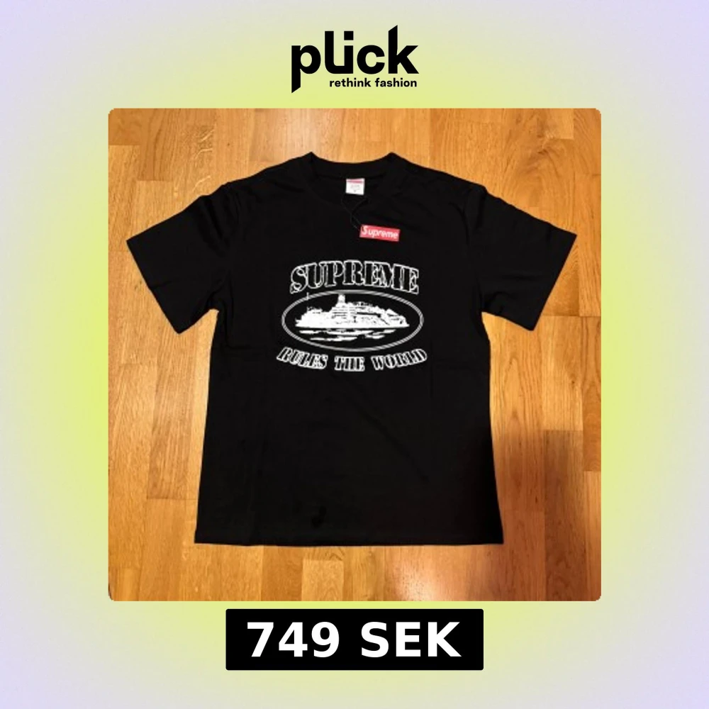 Supreme t-shirt i svart med stort vitt tryck på framsidan och handskriven text på ryggen. Klassisk Supreme box logo i rött och vitt. Rund hals och korta ärmar. Tillverkad i 100% bomull, skön och mjuk kvalitet. Perfekt för dig som gillar streetwear och statement-plagg.