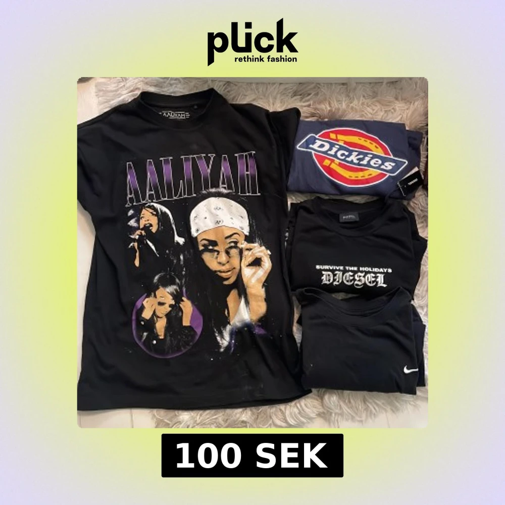 Cool svart t-shirt med stort Aaliyah-tryck framtill i lila och vitt. En dickies T-shirts. En Nike tröja, en diesel tröja. Säljer dom för 100kr/st. Förutom Nike och diesel som är för 50kr/st.