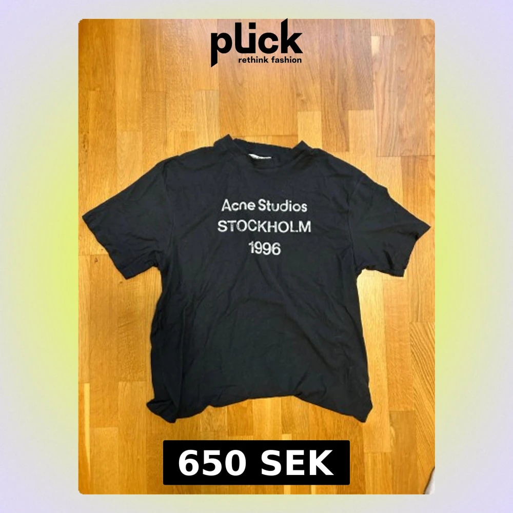 Svart t-shirt från Acne Studios med vit text 'Stockholm 1996' på bröstet. Klassisk rund hals och korta ärmar. Materialet är mjuk bomull och passformen är normal. Perfekt för dig som gillar stilrena och ikoniska plagg med streetkänsla. Storleken är Xs men passar S. Den här två små hål vid kragen men syns knappt