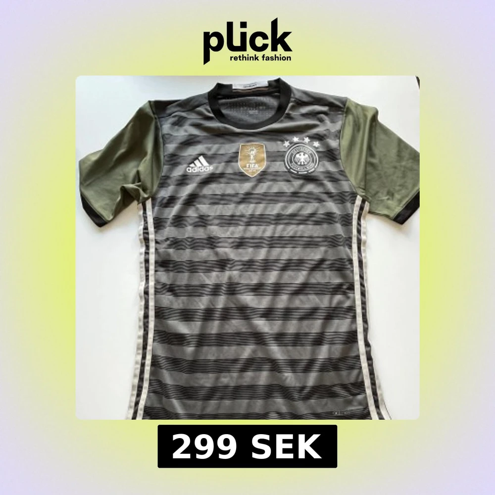 Snygg fotbollströja från Adidas med Tysklands landslagsmärke och FIFA 2014-emblem på bröstet. Tröjan är grå med svarta horisontella ränder och har olivgröna korta ärmar. Rund hals och vita detaljer längs sidorna. Perfekt för match eller träning. Köpt för 1500 kronor nu till ett pang pris för 299