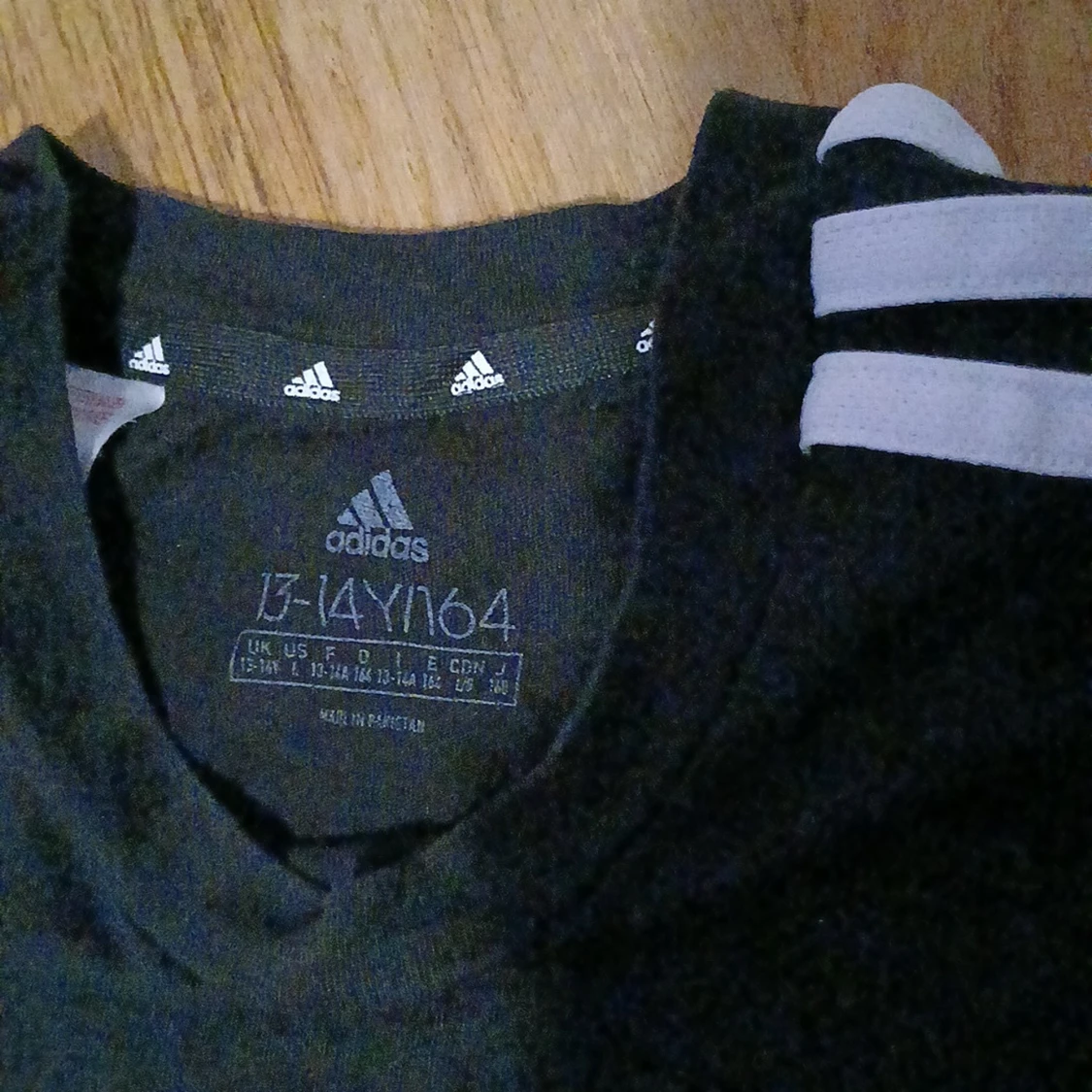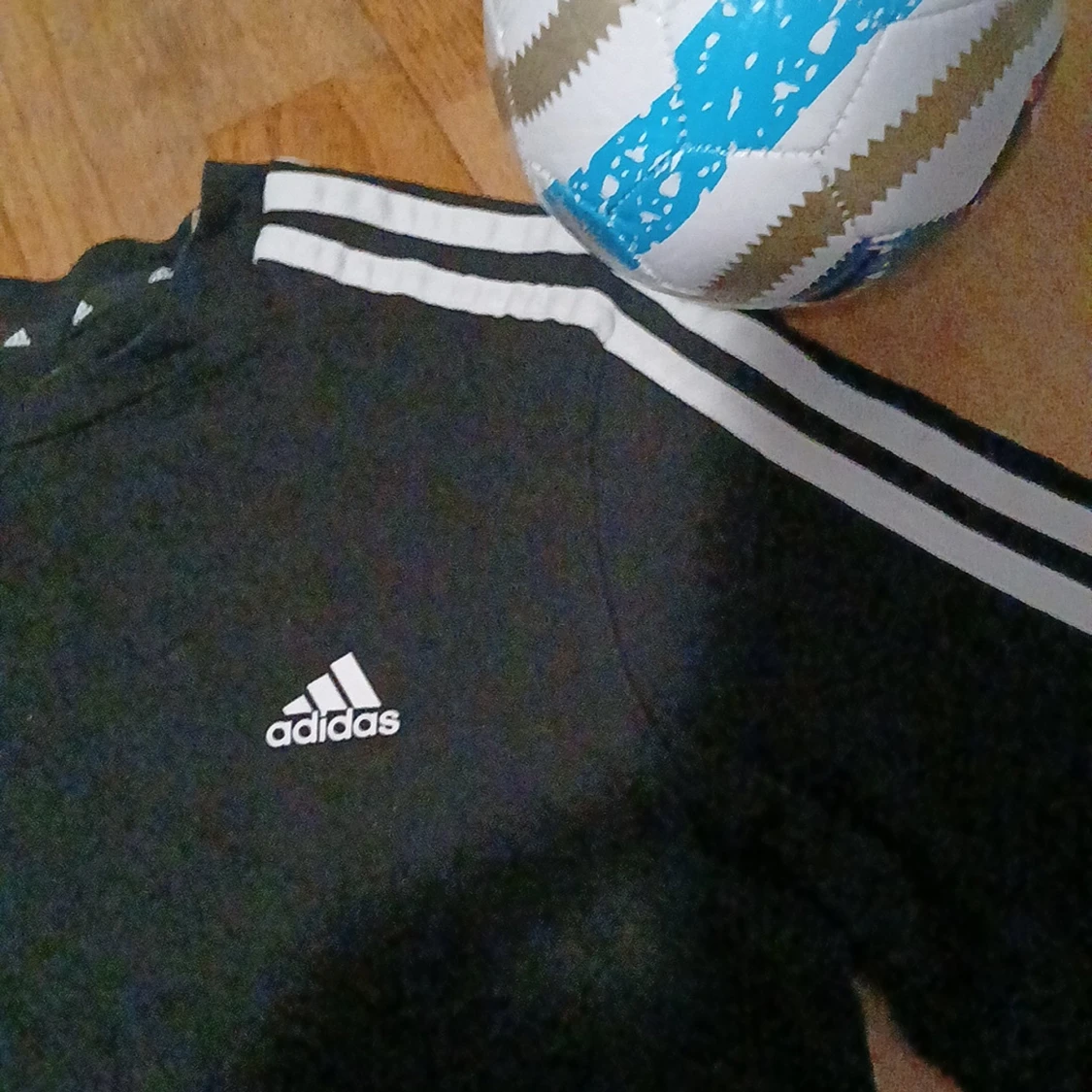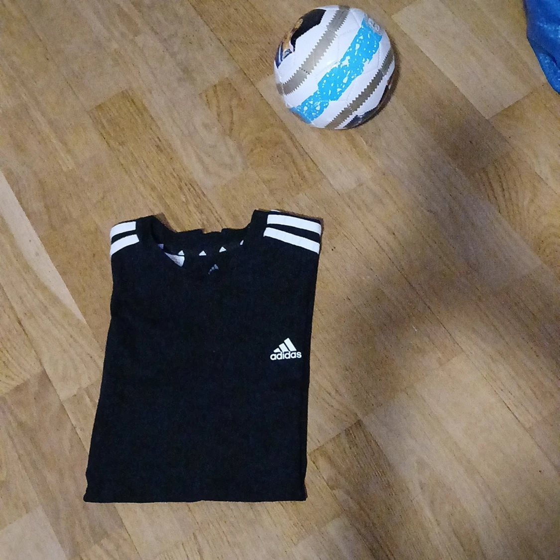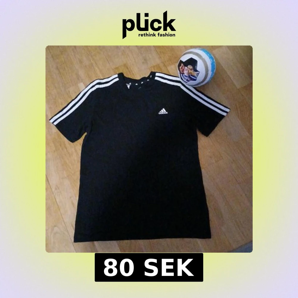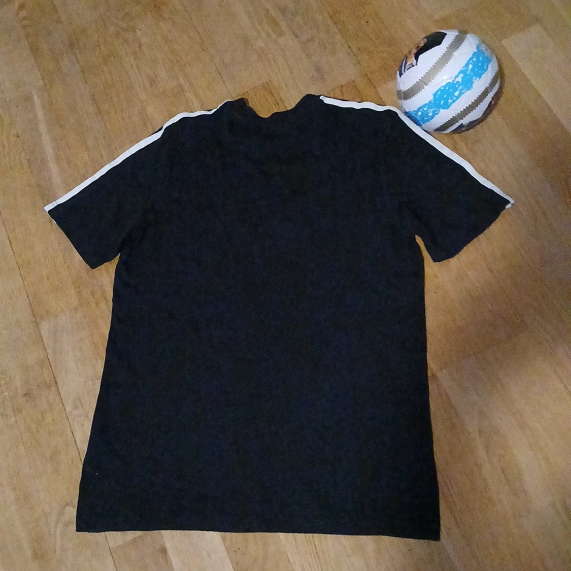Svart t-shirt från Adidas med klassiska vita ränder längs axlarna och ärmarna. Adidas-logga på bröstet. Skön passform och perfekt för fotboll eller träning. Tillverkad i mjukt material som andas.
