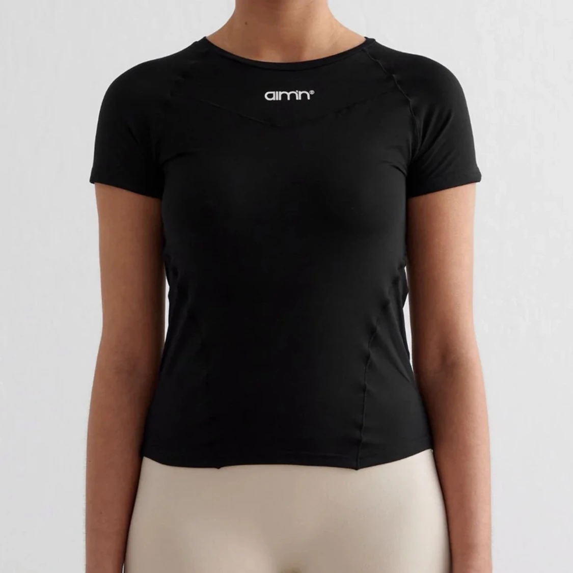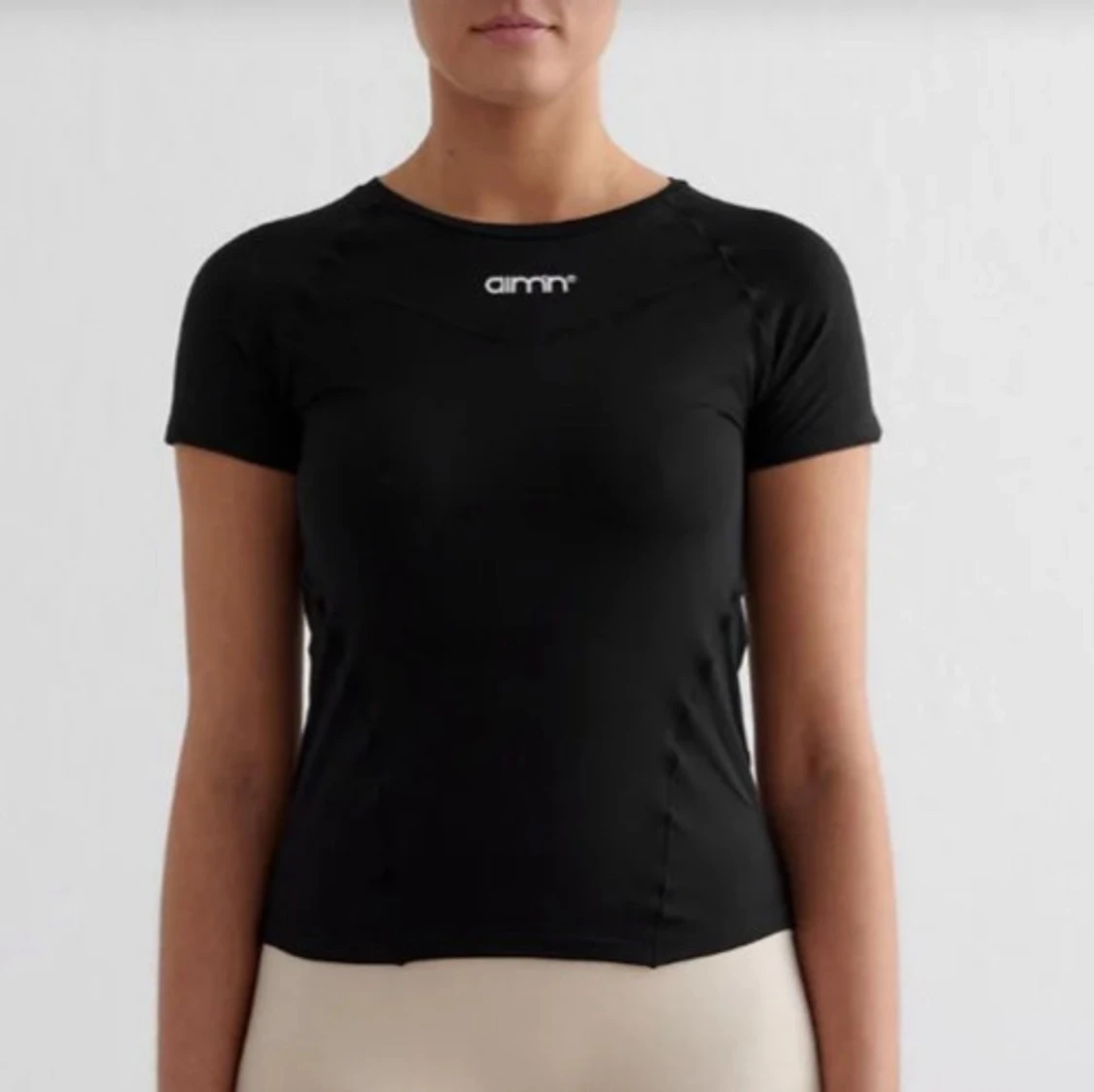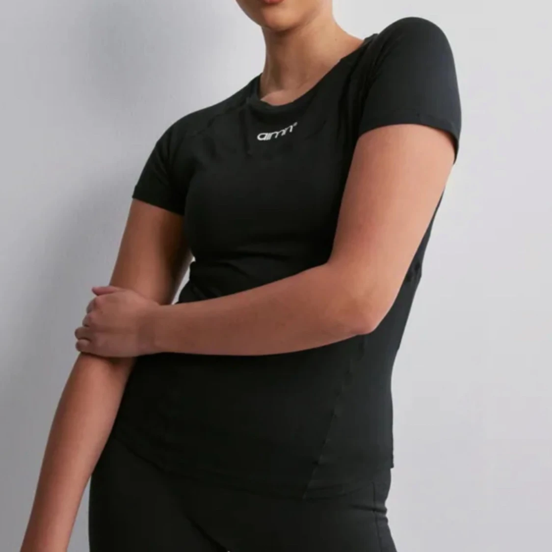 Svart t-shirt från AIM'N med korta ärmar och rund hals. Tillverkad i ett stretchigt funktionsmaterial som andas, perfekt för träning. Diskret logga framtill i vitt. Snygg och sportig passform som sitter nära kroppen. Inte använd alls mycket!