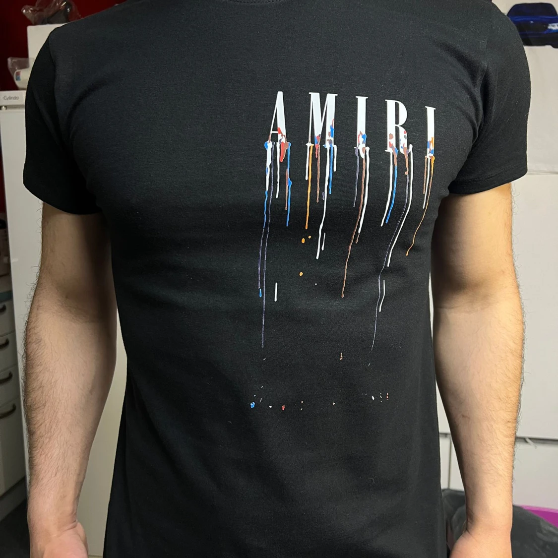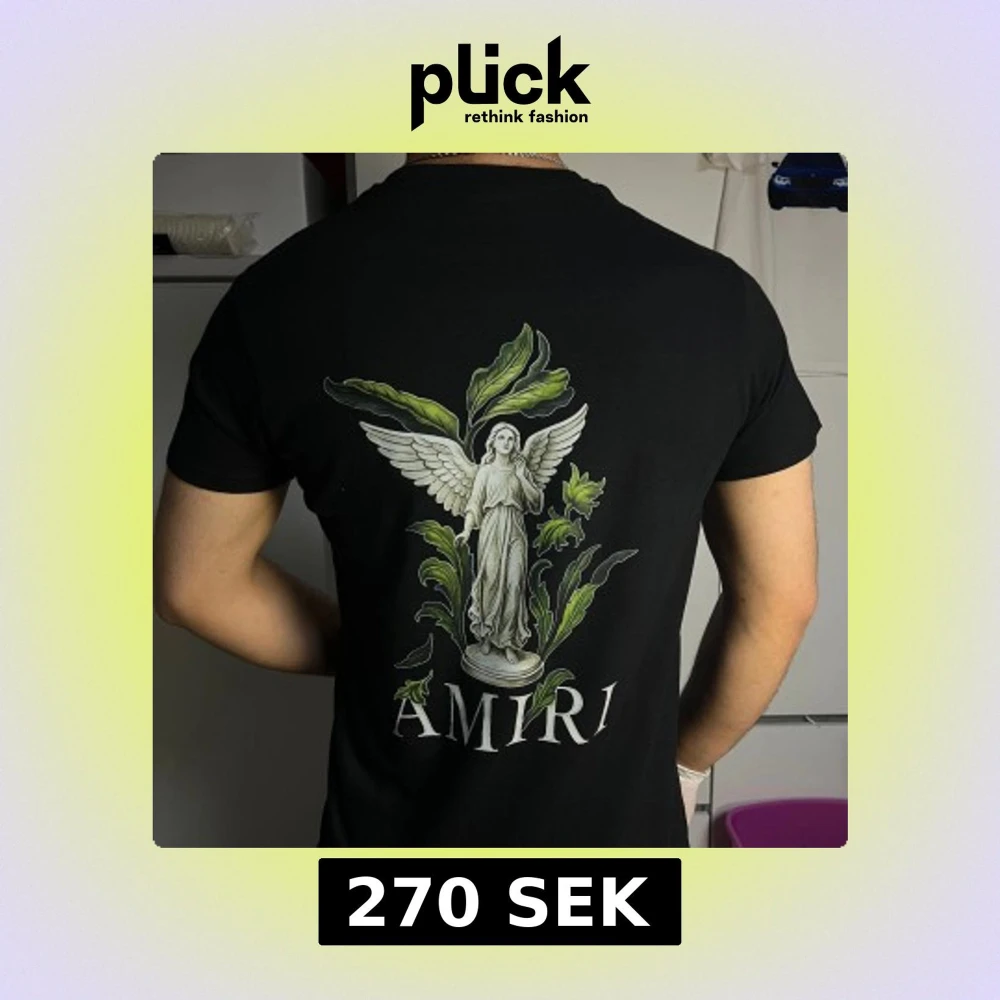 Svart t-shirt från Amiri med stort tryck av en ängel och gröna blad på ryggen samt Amiri-logga. Framsidan har Amiri-tryck med färgstänk som rinner ner. Klassisk passform och korta ärmar, tillverkad i mjuk bomull.