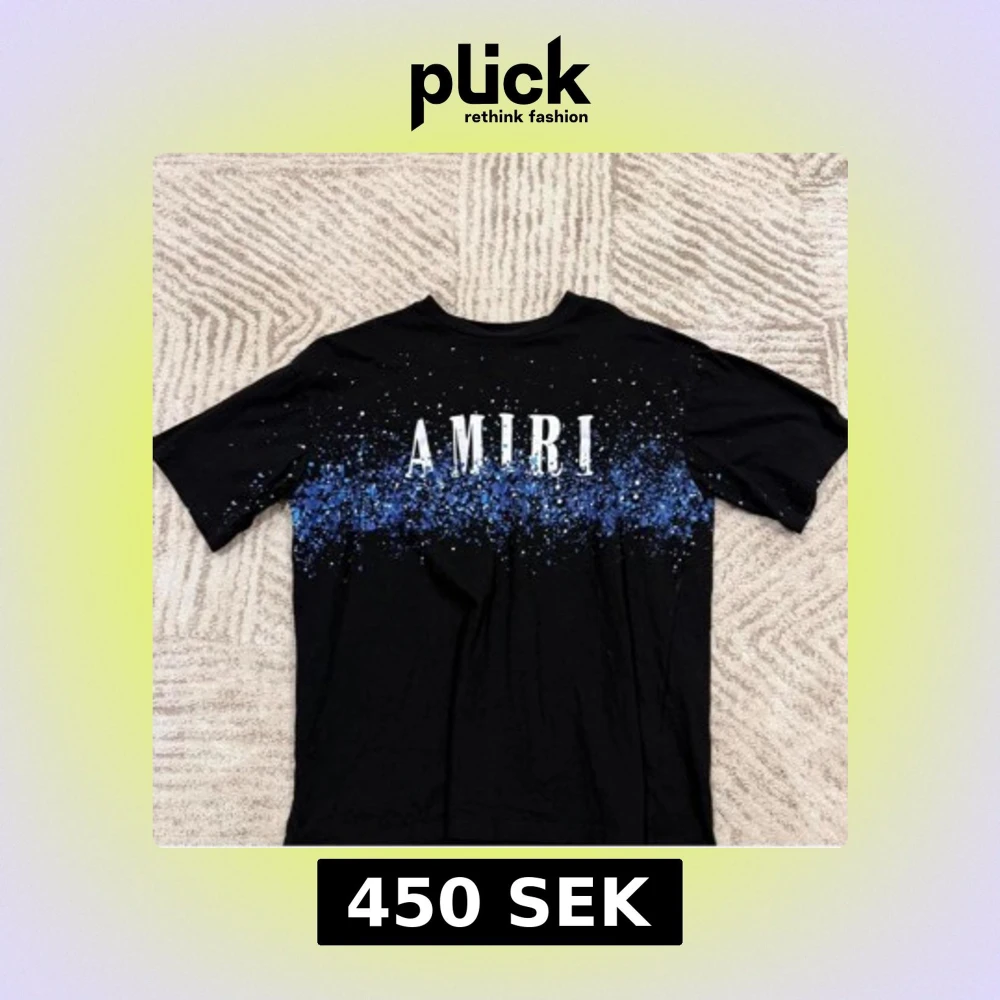 Snygg svart t-shirt från Amiri med stort vitt logotryck framtill och blått stänkmönster över bröstet och ryggen. Klassisk passform med rund hals och korta ärmar. Perfekt för dig som gillar streetwear och vill sticka ut lite extra.