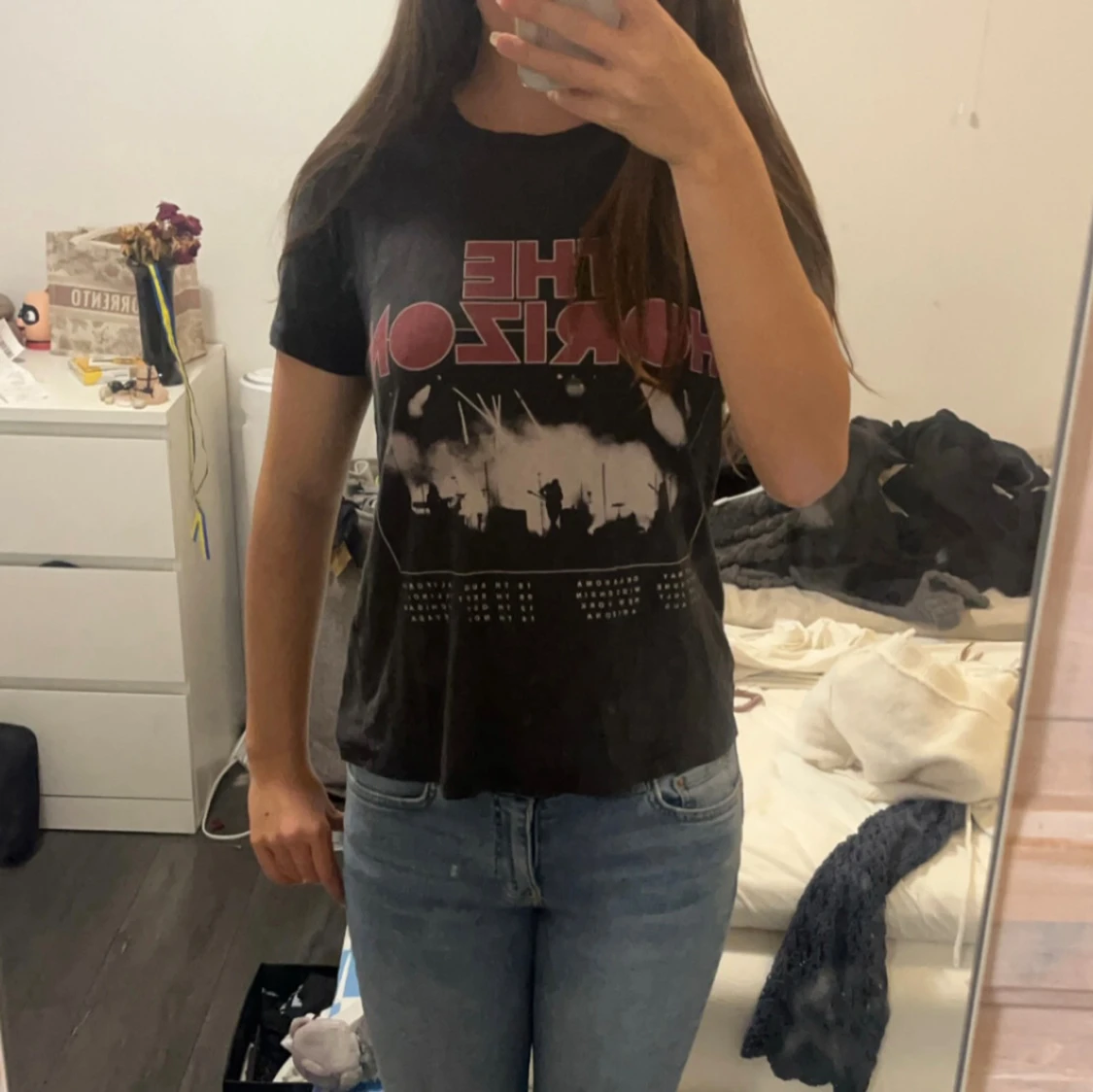Svart t-shirt med coolt bandtryck från Gina. Framsidan har en stor grafisk print med konsertsilhuetter och turnédatum. T-shirten är kortärmad och har en klassisk passform. Perfekt för dig som gillar musik och vill ha en avslappnad stil.