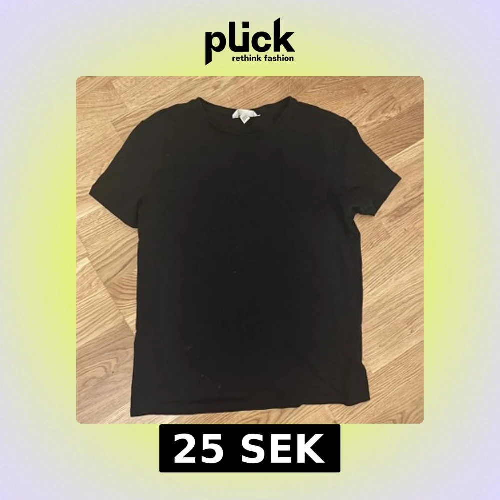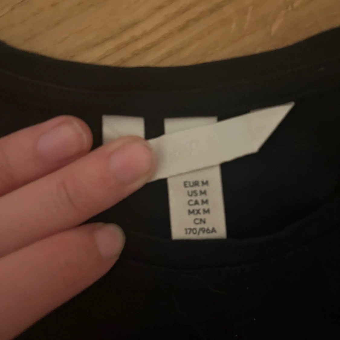 En klassisk svart t-shirt från H&M i storlek M. T-shirten har rund halsringning och korta ärmar, perfekt för en clean och enkel stil. Tillverkad i mjuk bomull som är skön att bära hela dagen.