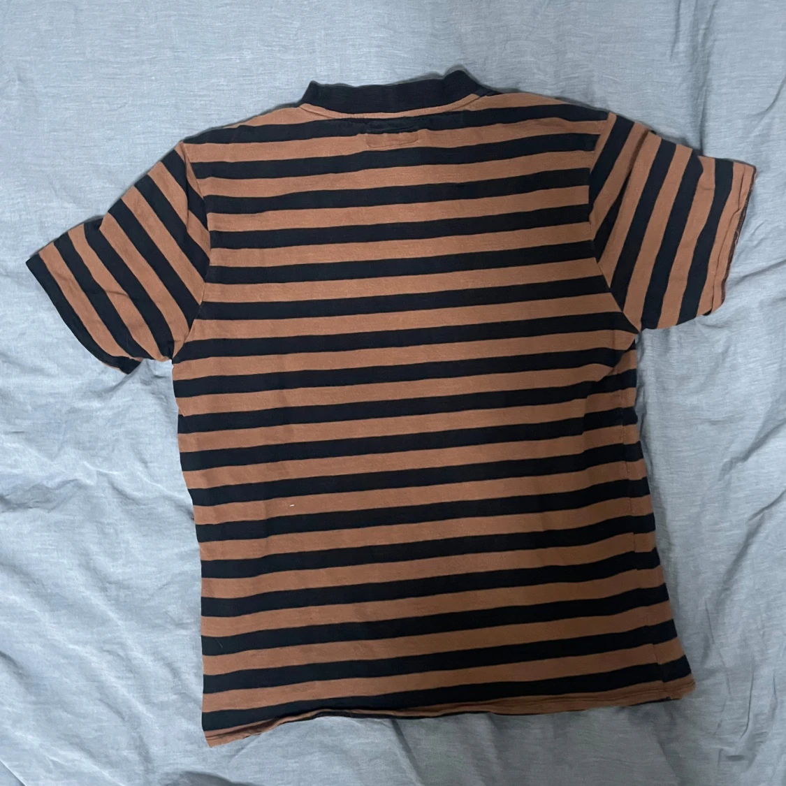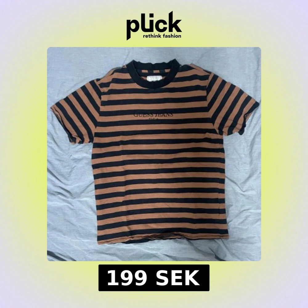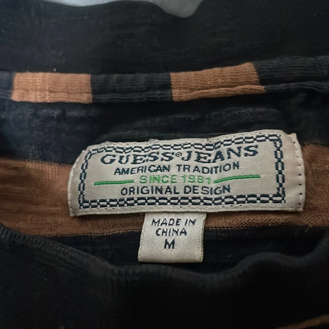 Säljer en cool randig t-shirt från Guess Jeans i svart och brun. Den har korta ärmar och en klassisk rund halsringning. Perfekt för en avslappnad stil. Storlek Medium passar också small tycker jag