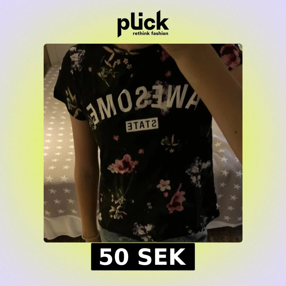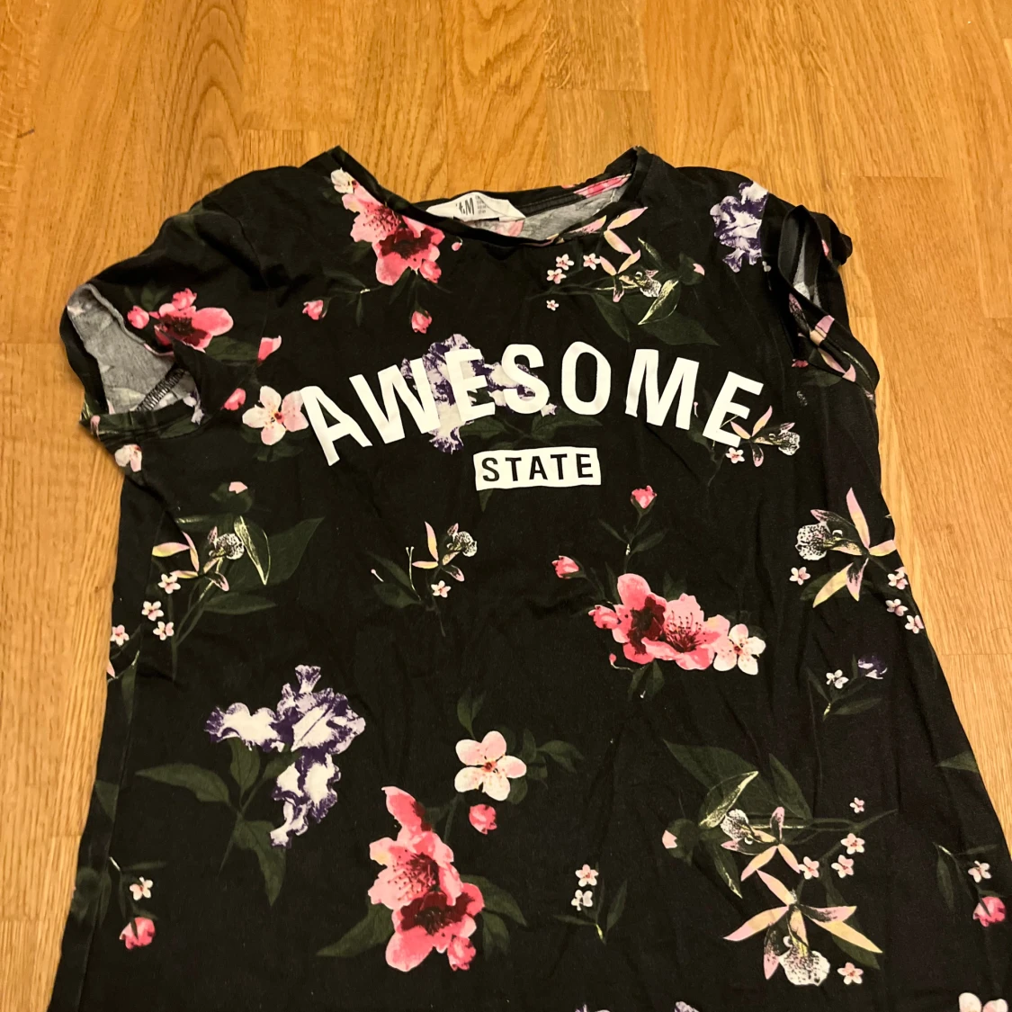 Cool svart t-shirt från H&M med trycket 'AWESOME STATE' på bröstet och färgglada blommor i rosa, lila och vitt över hela plagget. Rund hals och korta ärmar, perfekt för dig som gillar statement-plagg med lite extra färg. Materialet är mjuk bomull. Har inte använt mycket så i bra skick. Står att de är stl 158/164, men passar mig som har XS-S i vanliga fall. Hör gärna av er om frågor!❤️