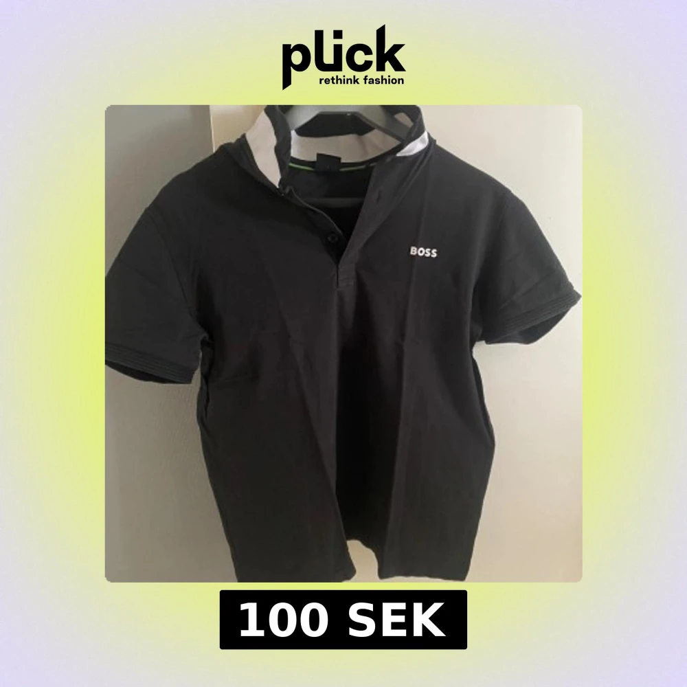 Svart t-shirt från BOSS med vit kontrastkrage och diskret logotyp på bröstet. Klassisk kortärmad modell med knappslå vid halsen. Tillverkad i mjuk bomull som känns skön mot huden. Perfekt för dig som gillar stilrena och enkla plagg med snygga detaljer.