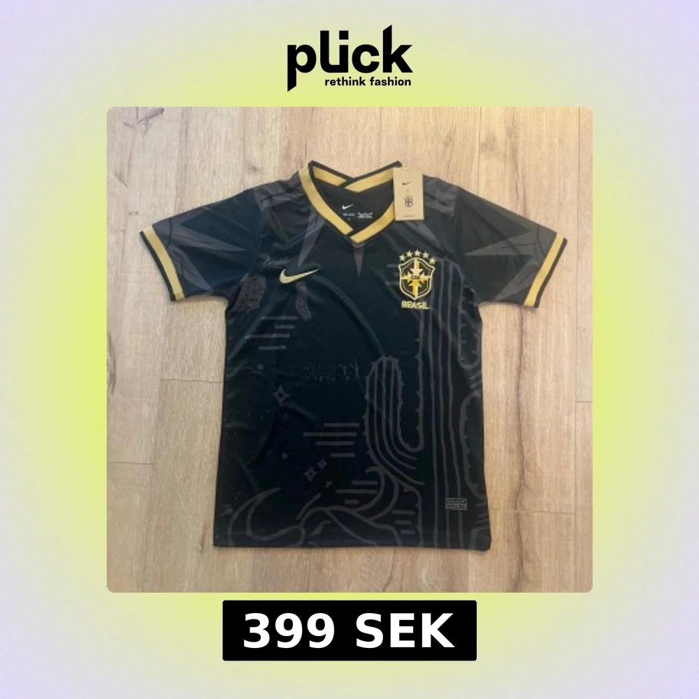 Snygg svart Brasilien fotbollströja från Nike med guldiga detaljer och tryck. Tröjan har korta ärmar, V-ringad krage med guldkant och Brasil-logga på bröstet. Tillverkad i lätt, ventilerande Dri-FIT material som passar perfekt för träning eller match.