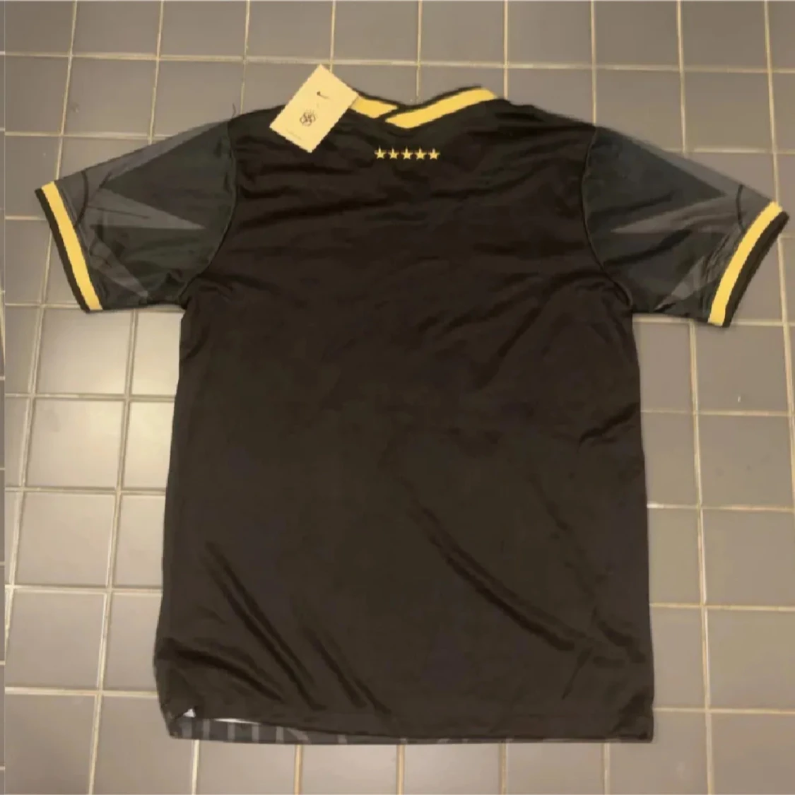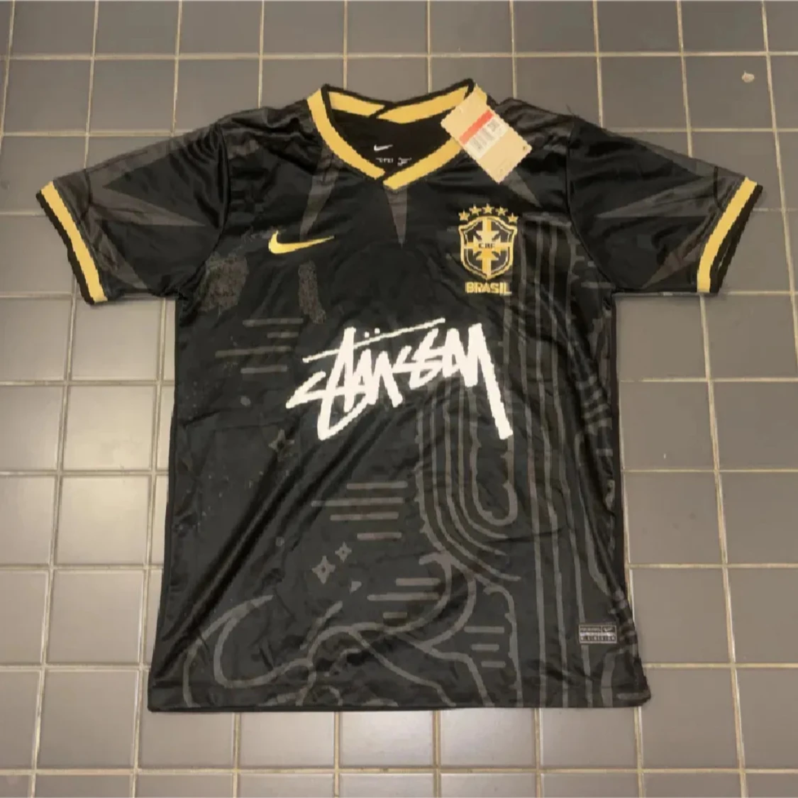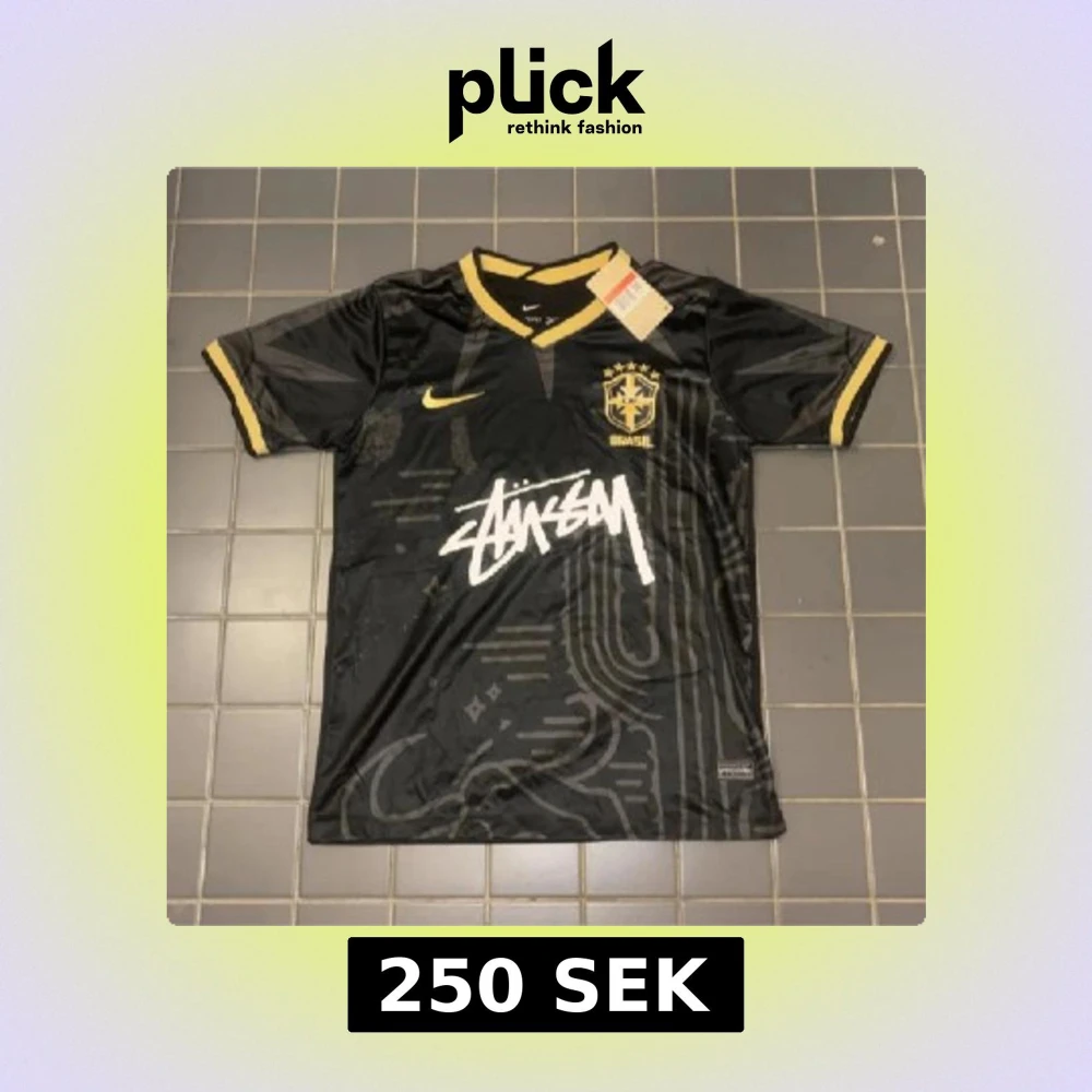 Exklusiv svart Brasil fotbollströja från Nike i samarbete med Stüssy. Tröjan har gula detaljer på krage och ärmslut, Brasil-logga på bröstet och Stüssy-tryck framtill. Tillverkad i Dri-FIT-material som andas, perfekt för fotboll eller streetwear.