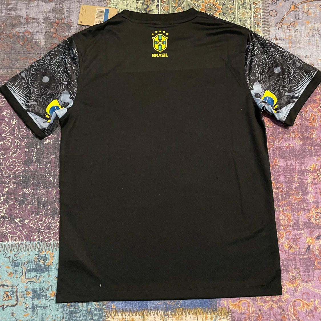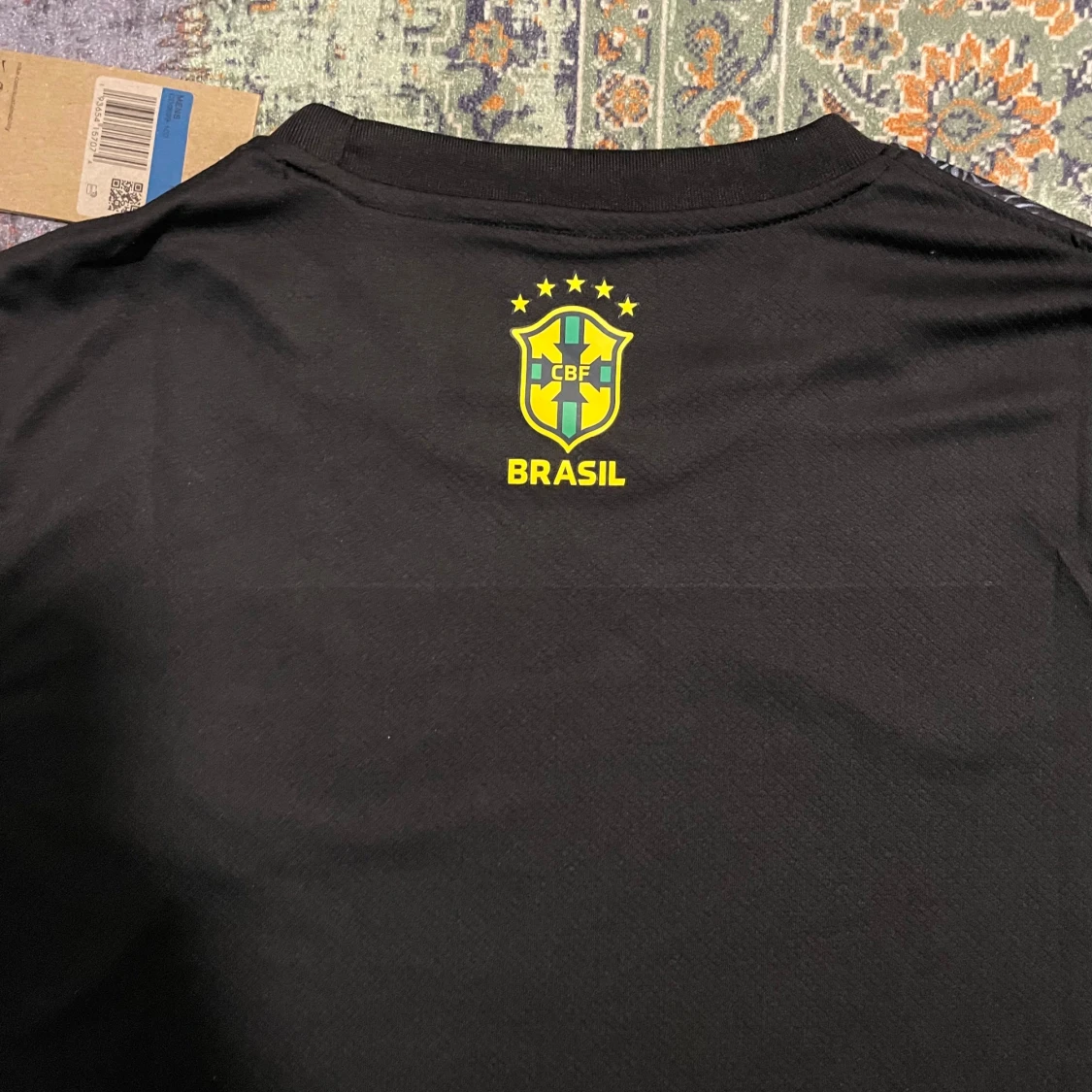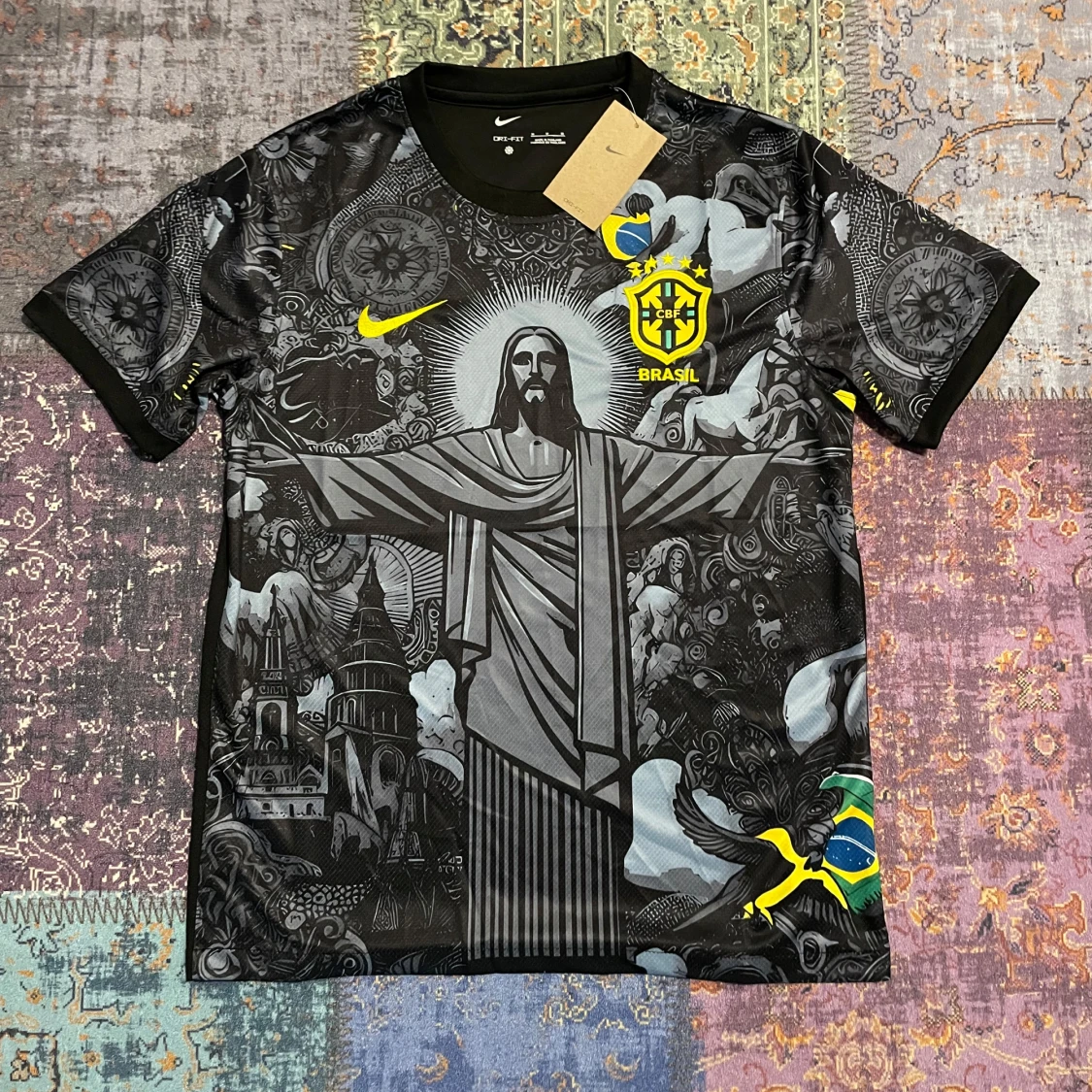 Snygg svart fotbollströja från Nike med Brasilien-tema. Tröjan har ett detaljerat mönster med Kristusstatyn och andra ikoner. Den har korta ärmar och det brasilianska landslagets emblem i gult på bröstet och ryggen. Perfekt för fotbollsfans! Priset kan diskuteras!