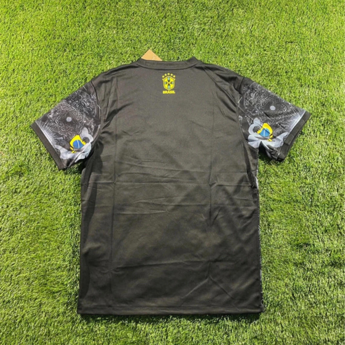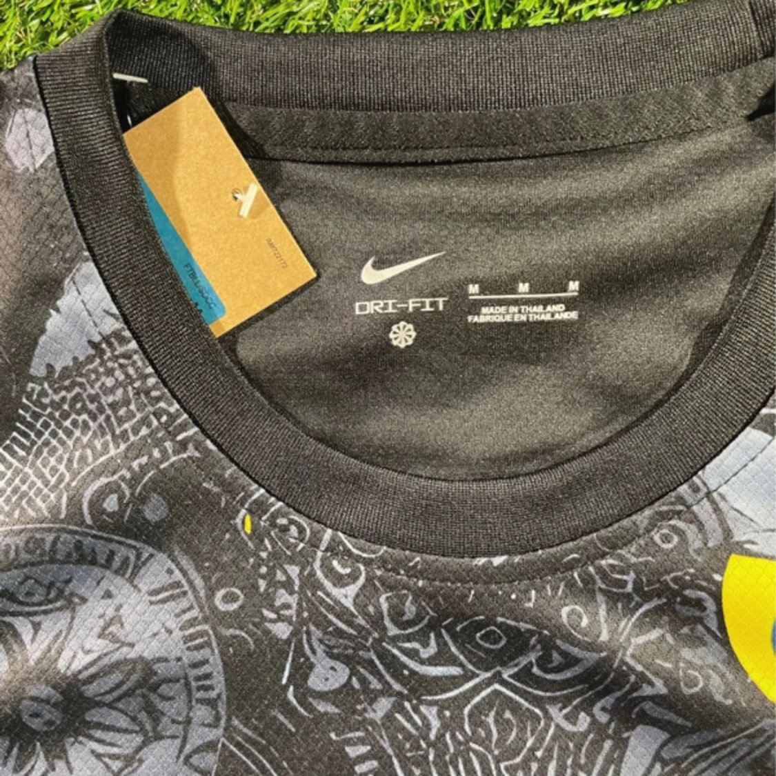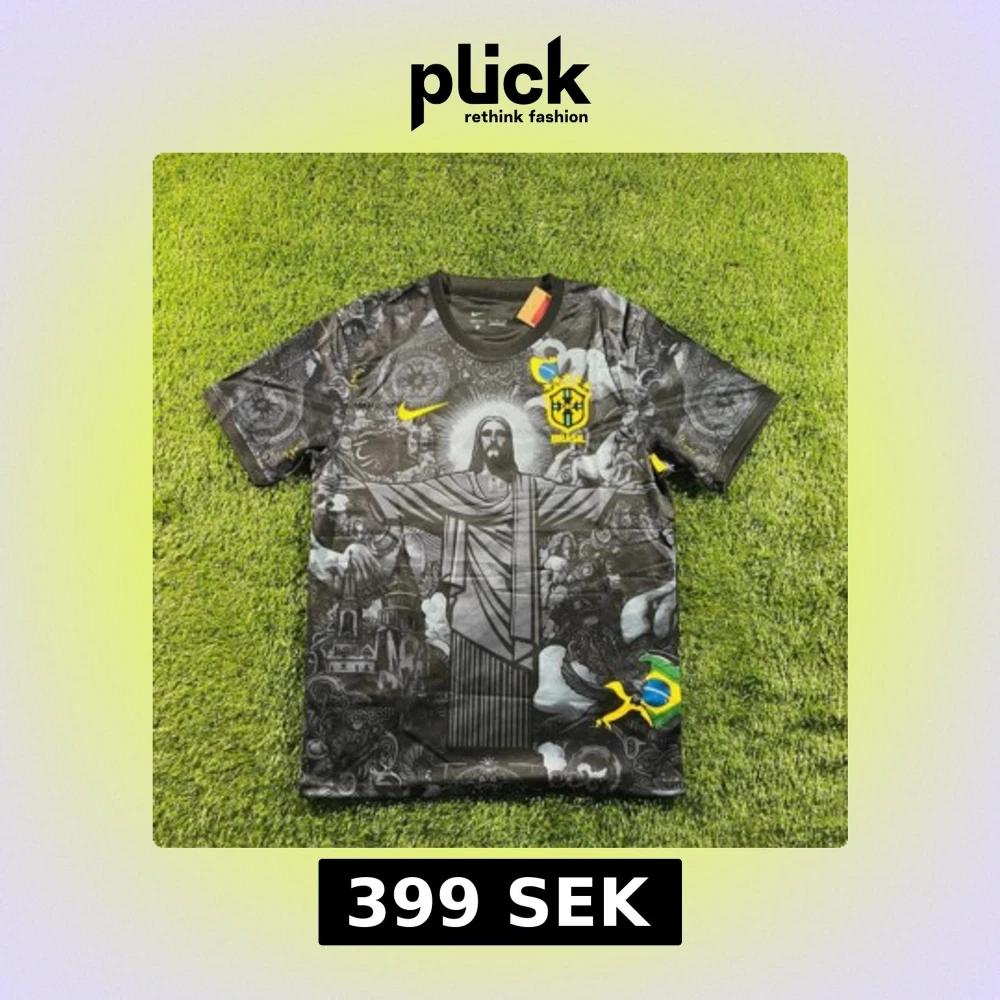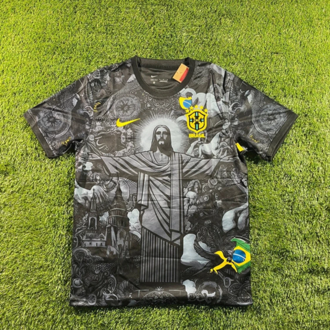 Unik svart Brasilien fotbollströja från Nike med detaljerat tryck av Kristusstatyn och brasilianska symboler. Tröjan har korta ärmar, gul Nike-logga och Brasilien-emblem på bröstet. Tillverkad i Dri-FIT-material som andas och passar perfekt för träning eller match.