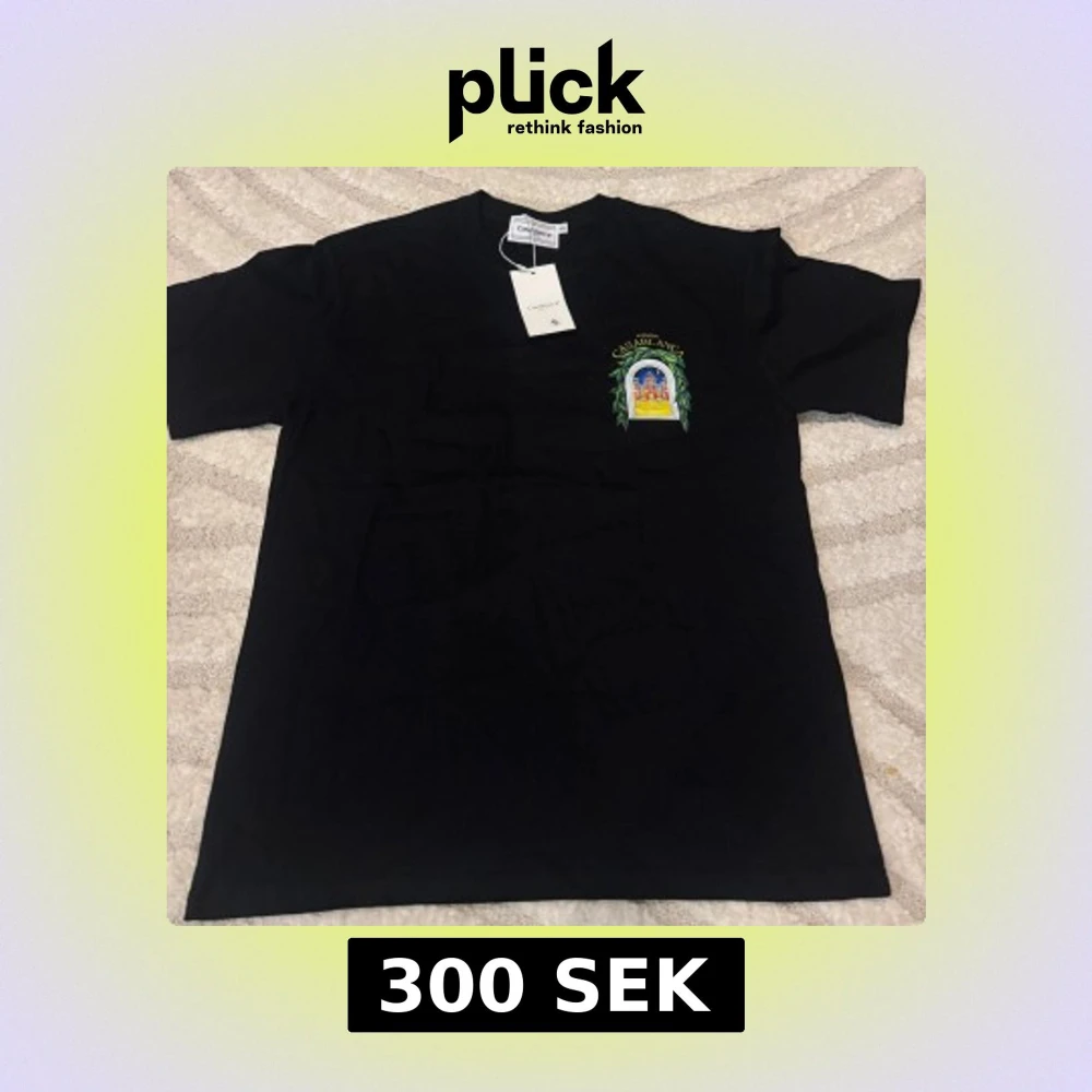Svart t-shirt från Casablanca med färgstarkt tryck av en byggnad och gröna blad på ryggen samt mindre tryck på bröstet. Modellen har rund hals och korta ärmar. Materialet är mjuk bomull och passformen är normal. Inte äka men kommer med lapp osv.