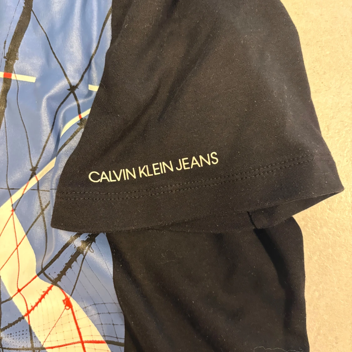 Svart t-shirt från Calvin Klein Jeans med stort grafiskt tryck på bröstet där CK-loggan syns över en cool stadsbild i blått, vitt och rött. Klassisk rund hals och korta ärmar. Materialet är mjuk bomull och loggan finns även tryckt på ärmen.