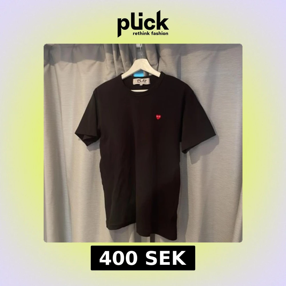 Svart t-shirt från Comme des Garçons Play med klassisk rund hals och korta ärmar. På bröstet sitter det ikoniska röda hjärtat med ögon, broderat. T-shirten är i mjuk bomull och har en clean, normal passform som funkar till allt.