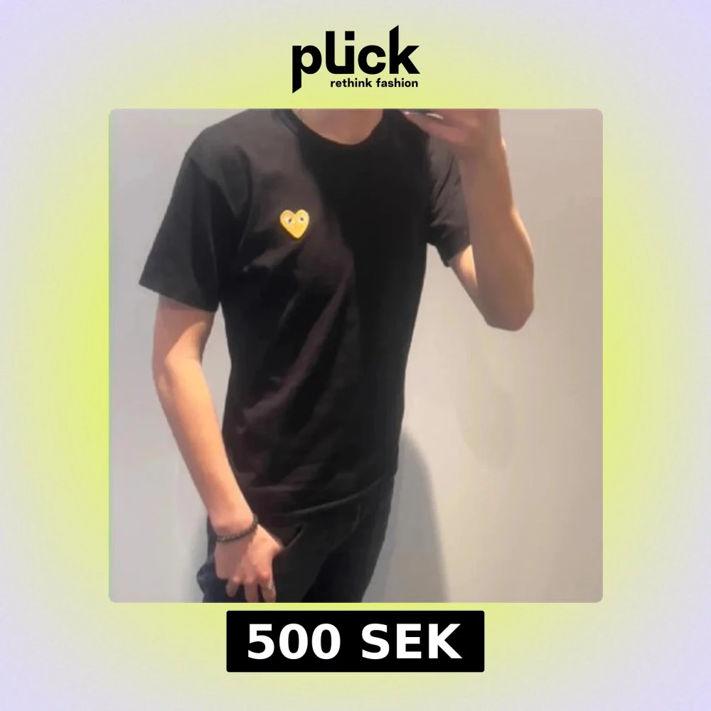 Svart t-shirt från Comme des Garçons Play med det ikoniska gula hjärtat med ögon broderat på bröstet. Klassisk passform, rund hals och korta ärmar. Tillverkad i mjuk bomull, perfekt för en clean och stilren look.