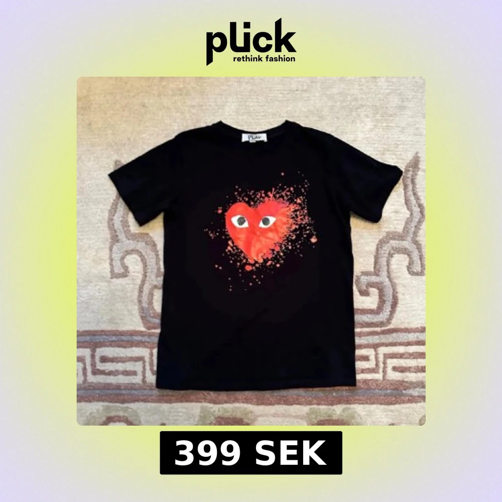 Säljer en svart t-shirt från Comme des Garçons PLAY med det ikoniska röda hjärtat med ögon på bröstet. T-shirten har korta ärmar och en klassisk passform. Perfekt för dig som vill sticka ut lite extra.