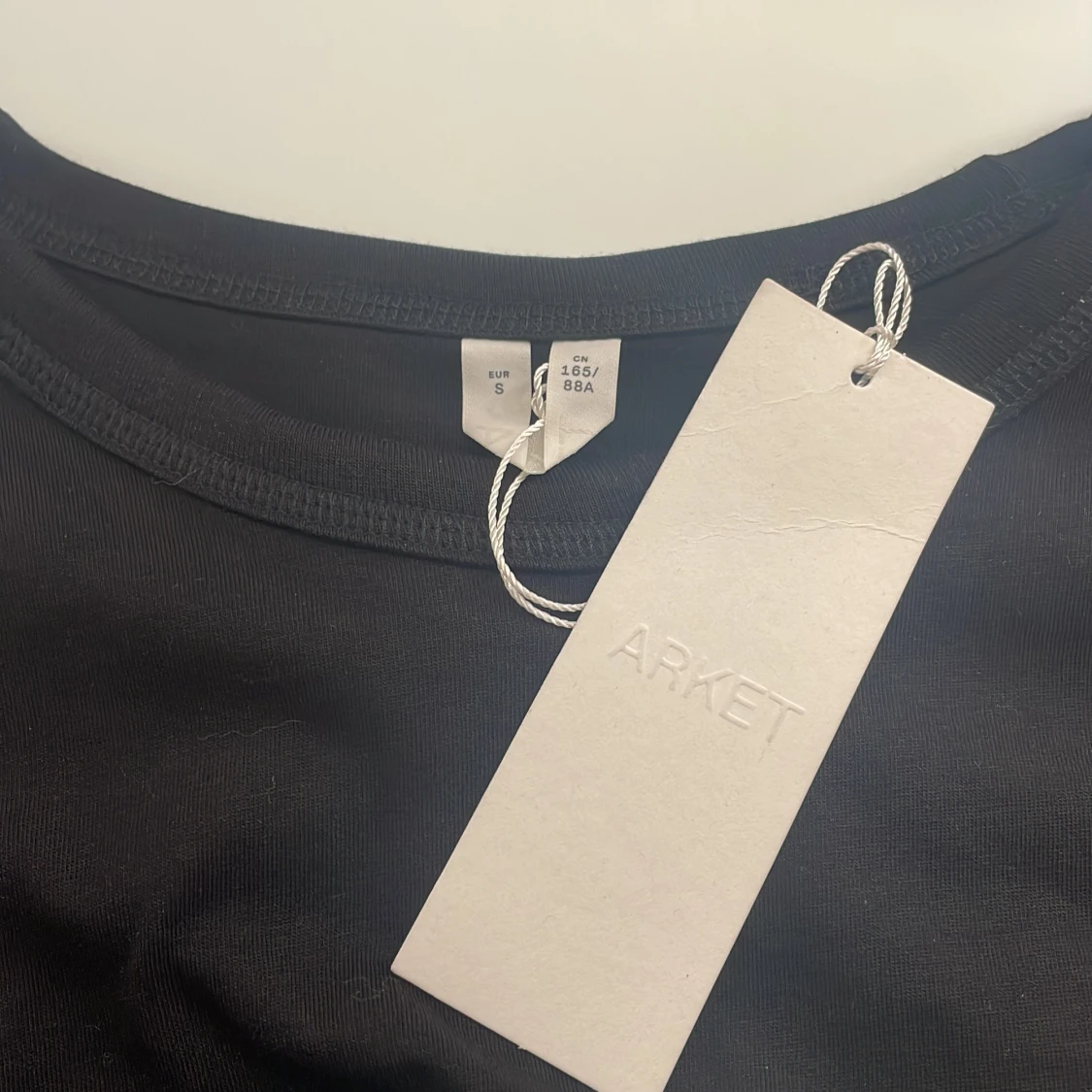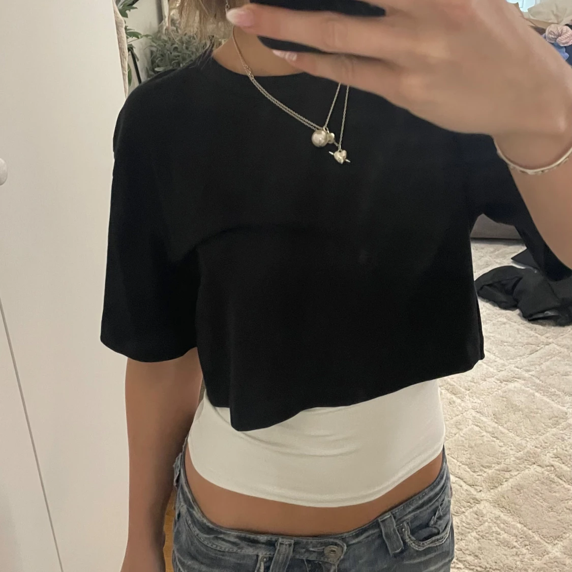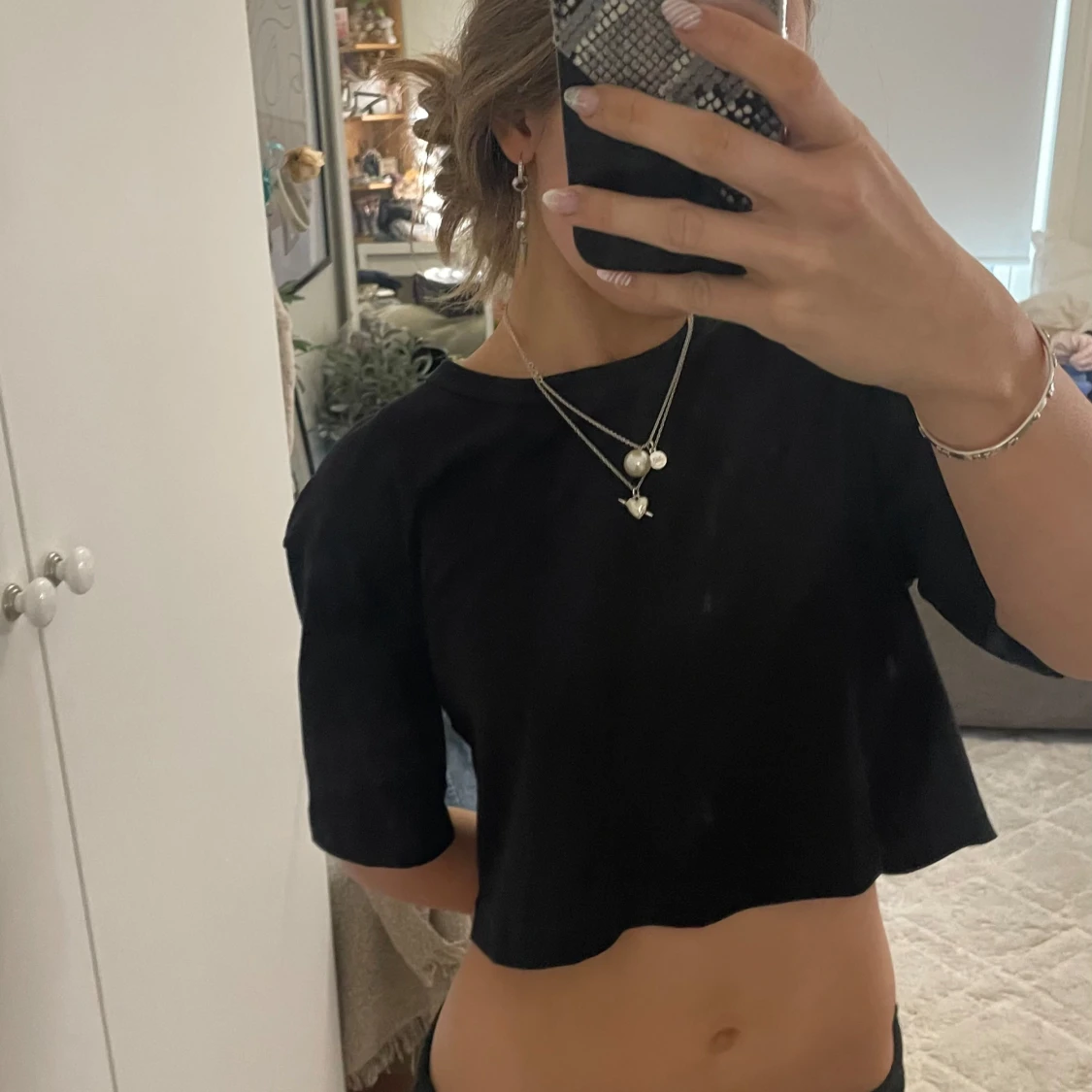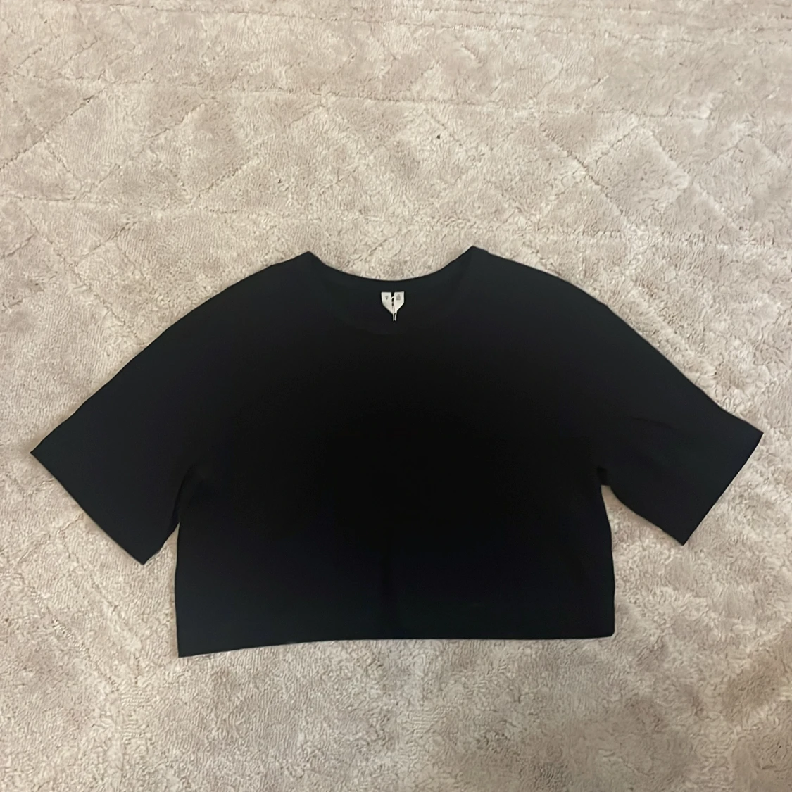 (INTRESSEKOLL) En stilren svart croppad t-shirt från Arket med korta ärmar. Har ett fint fall och passar bra med eller utan linne under.
