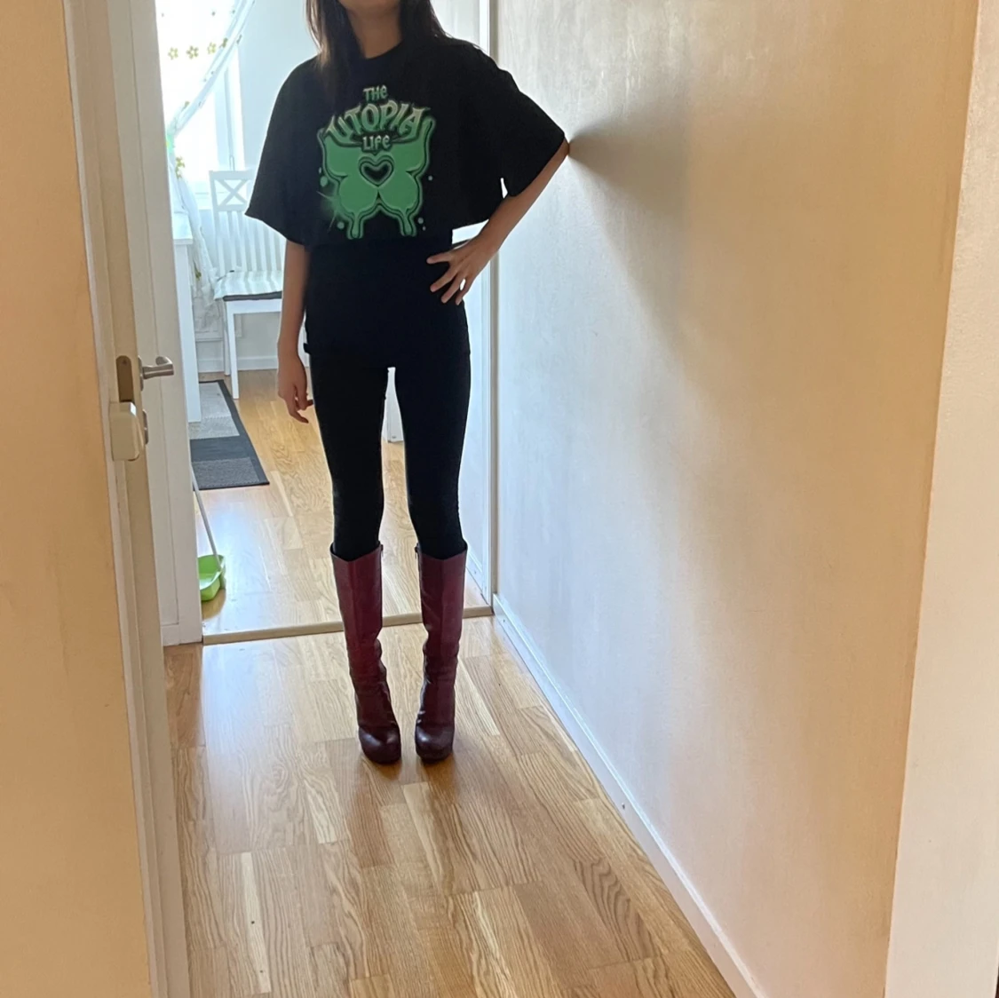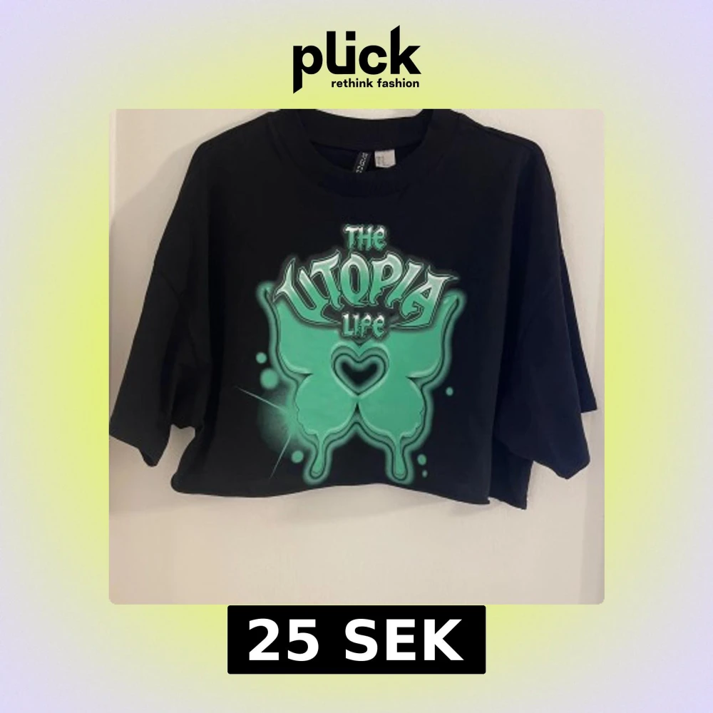 Cool svart croppad t-shirt från H&M Divided med stort grönt tryck framtill där det står 'The Utopia Life'. Oversized passform och korta ärmar, perfekt till streetwear eller en avslappnad look.